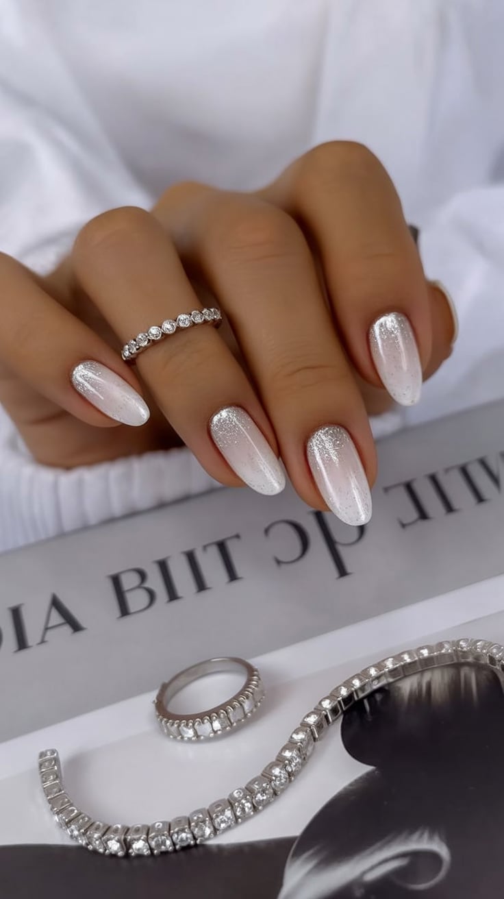 This is the manicure you pick when you want “pretty” but also a little flirty—like you’re saying yes to brunch, yes to plans, and yes to being seen. The fade has that airy, almost frosted vibe, and the shimmer reads like tiny snow-kissed light. It’s subtle glam, not disco, and it feels very white chrome nails 2026 in the most wearable way.