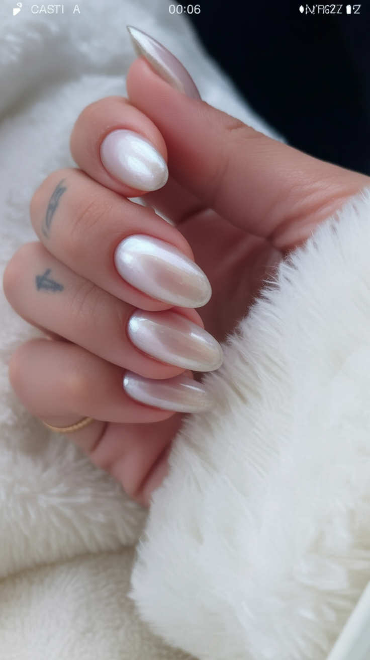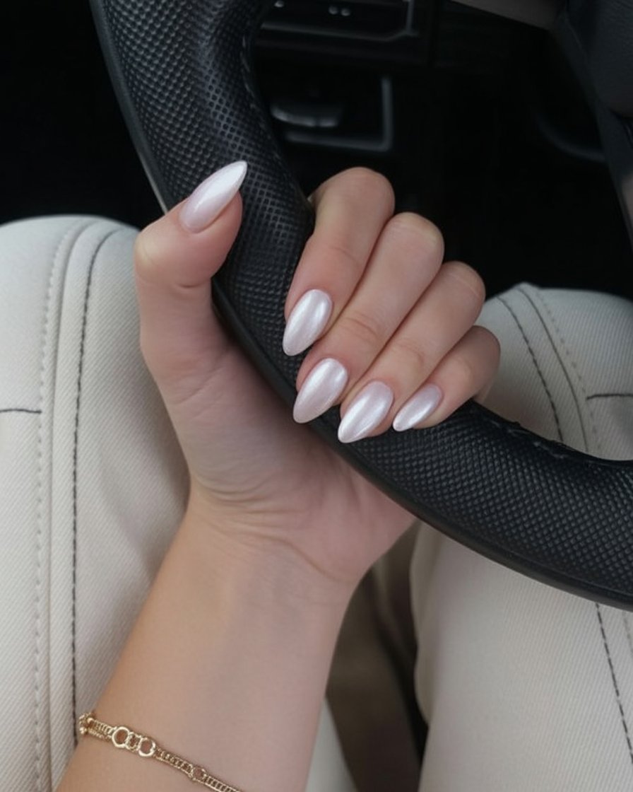 This is that “I’m glowing” manicure—soft, luminous, and very flattering in real-life lighting. The pearl finish gives a gentle, silky shine that doesn’t look harsh, and the almond shape keeps it elegant without feeling too precious. It’s the kind of set that makes you want to reach for your rings and actually enjoy the little details again.