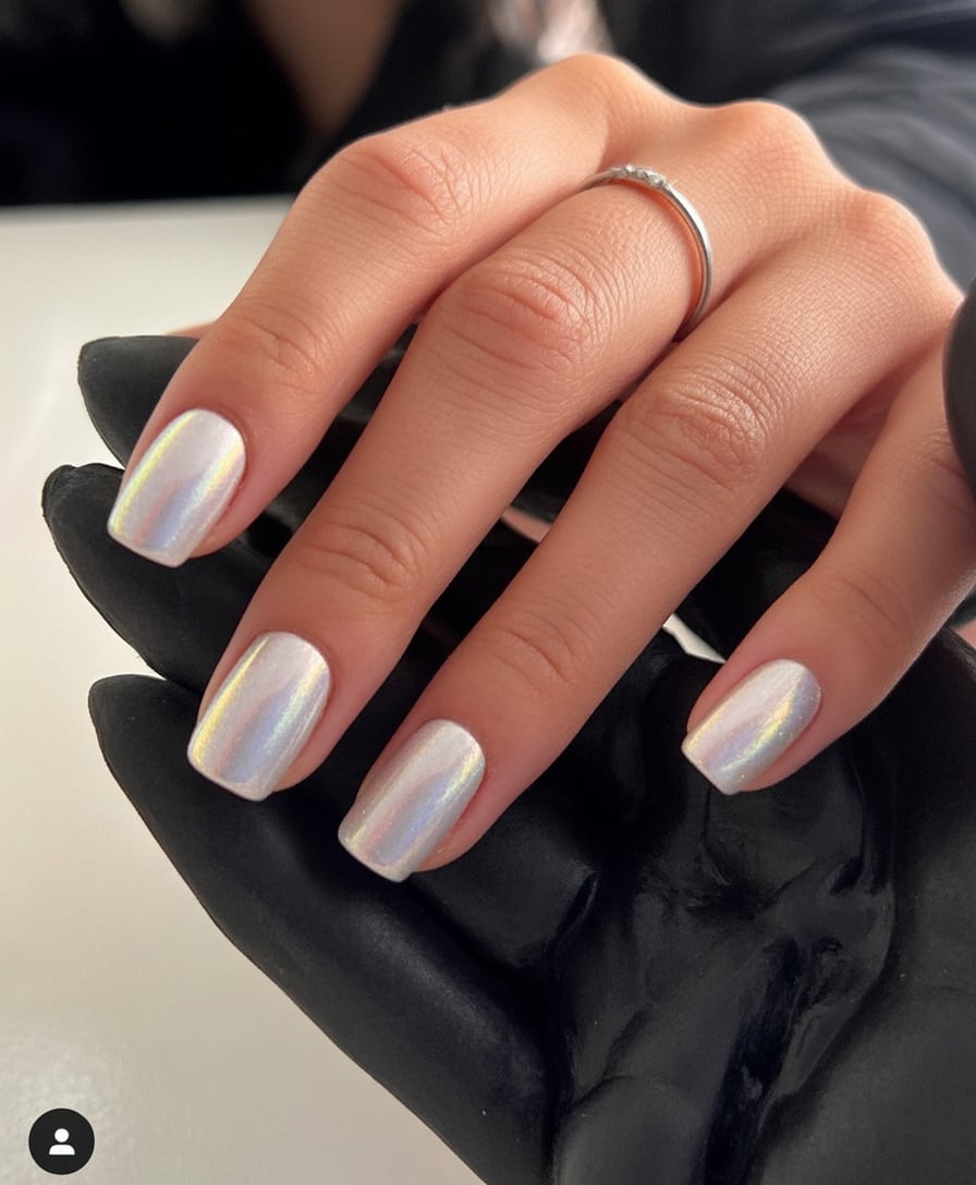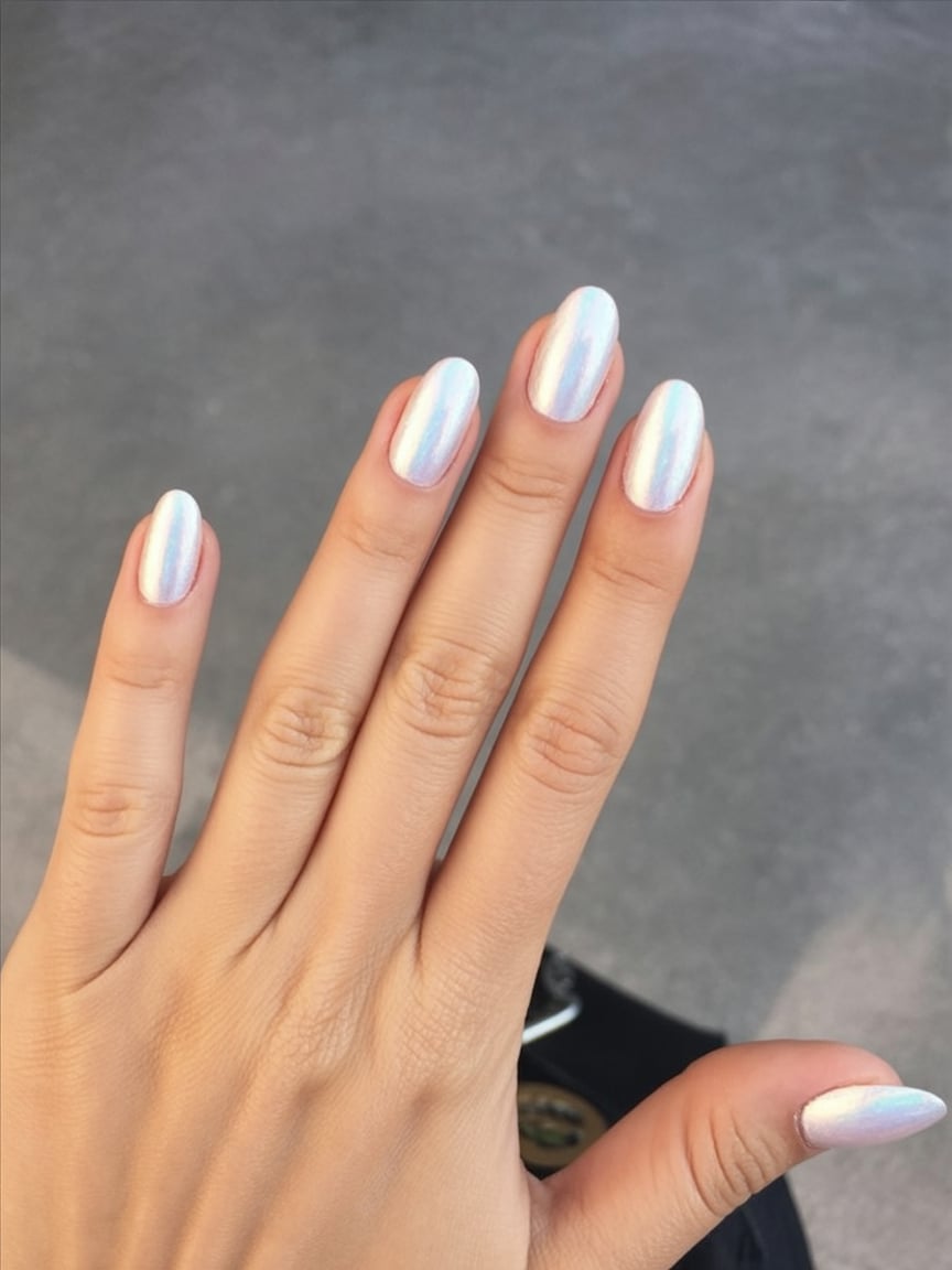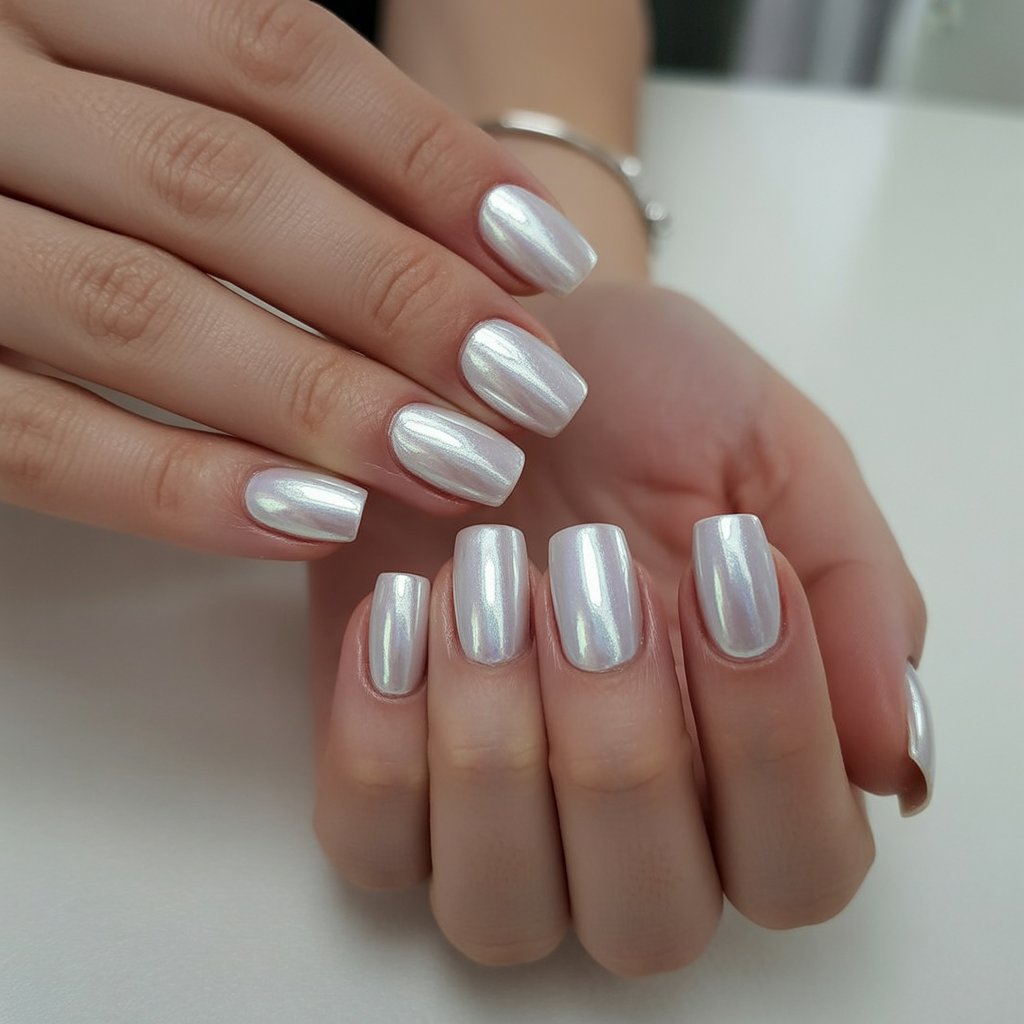 Okay, this one has attitude—in the best way. That icy shift makes the white look almost holographic, like a little secret sparkle that shows up when you move your hands. It’s sleek, slightly edgy, and still very wearable, which is exactly why chrome is staying popular.