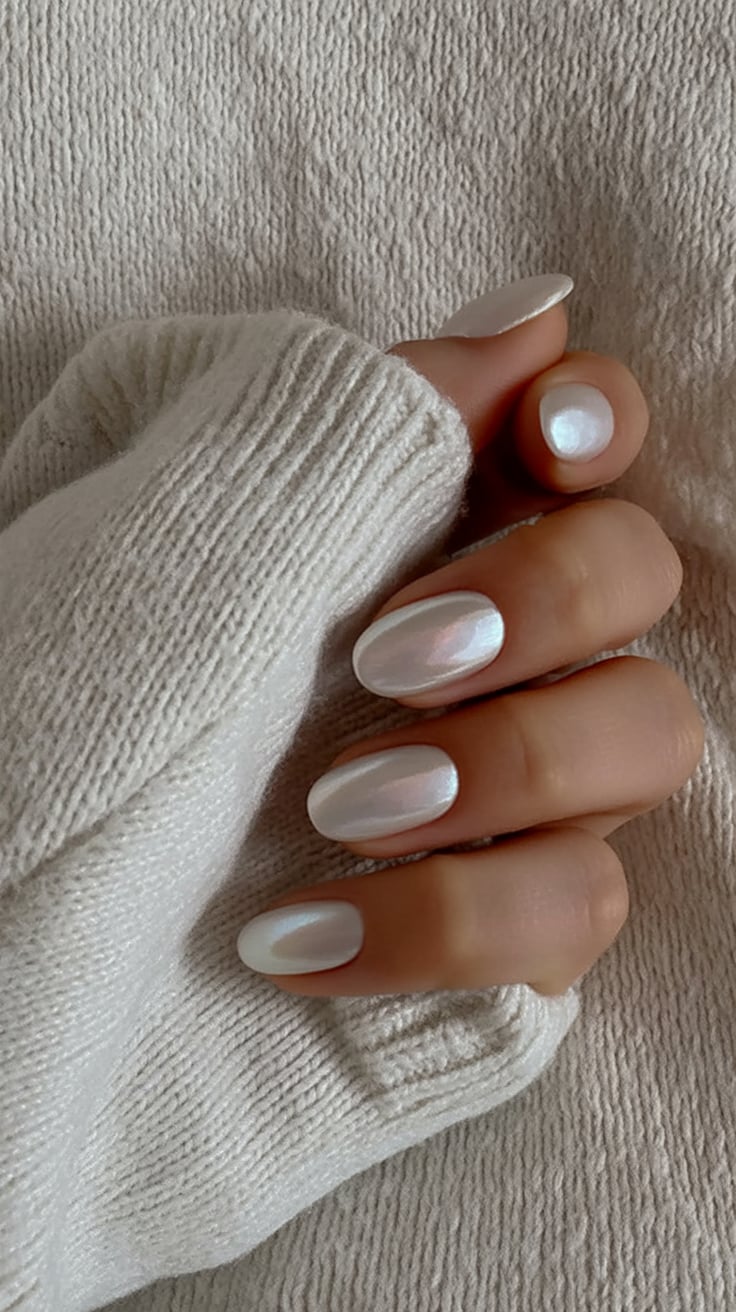 This look feels like the ultimate cool-girl neutral: white, glossy, and bright—yet somehow it works with casual outfits like it was meant to. The chrome glow makes your nails look fresh and healthy, not just painted. It’s simple, but it has that “expensive manicure” finish that elevates everything.