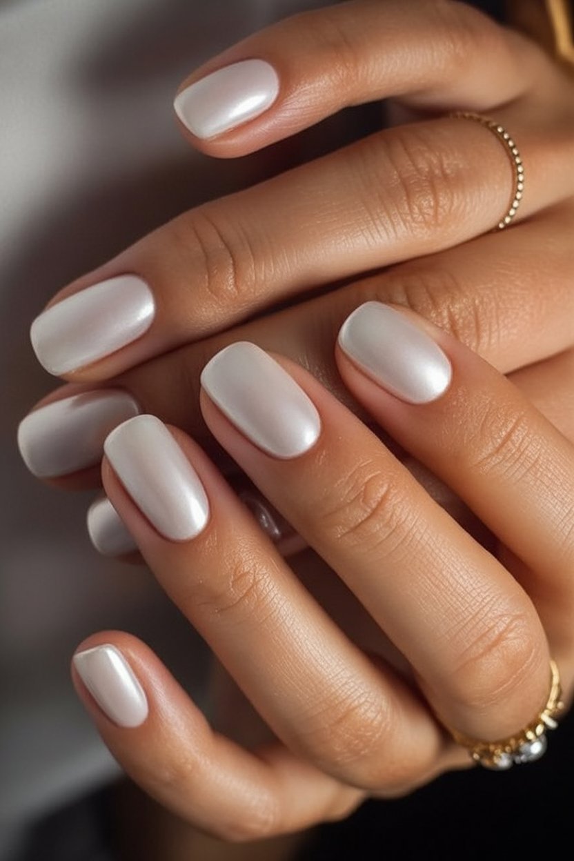 This look feels like a warm latte and a clean calendar—calm, soft, and quietly confident. The milky white base keeps it gentle (not stark), while that pearly sheen gives your nails a fresh, “healthy glow” finish that looks expensive in every kind of light. It’s understated, but it still catches attention in that grown-woman way—no fuss, just good taste.