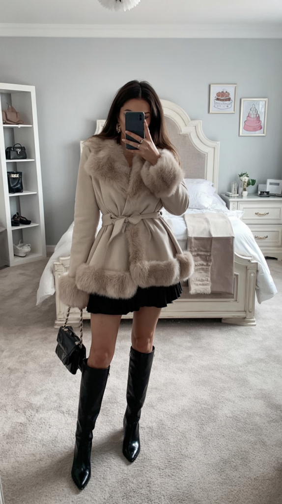 It is the definition of birthday glam in the winter with this homey and eye-catching look. The fur-trimmed coat matched by the fur-trimmed boots will have heads turning and will keep you warm. Its dreamy winter style allows it to be used at night parties with glittering lights and provide you with the feeling of a snow queen without losing comfort.