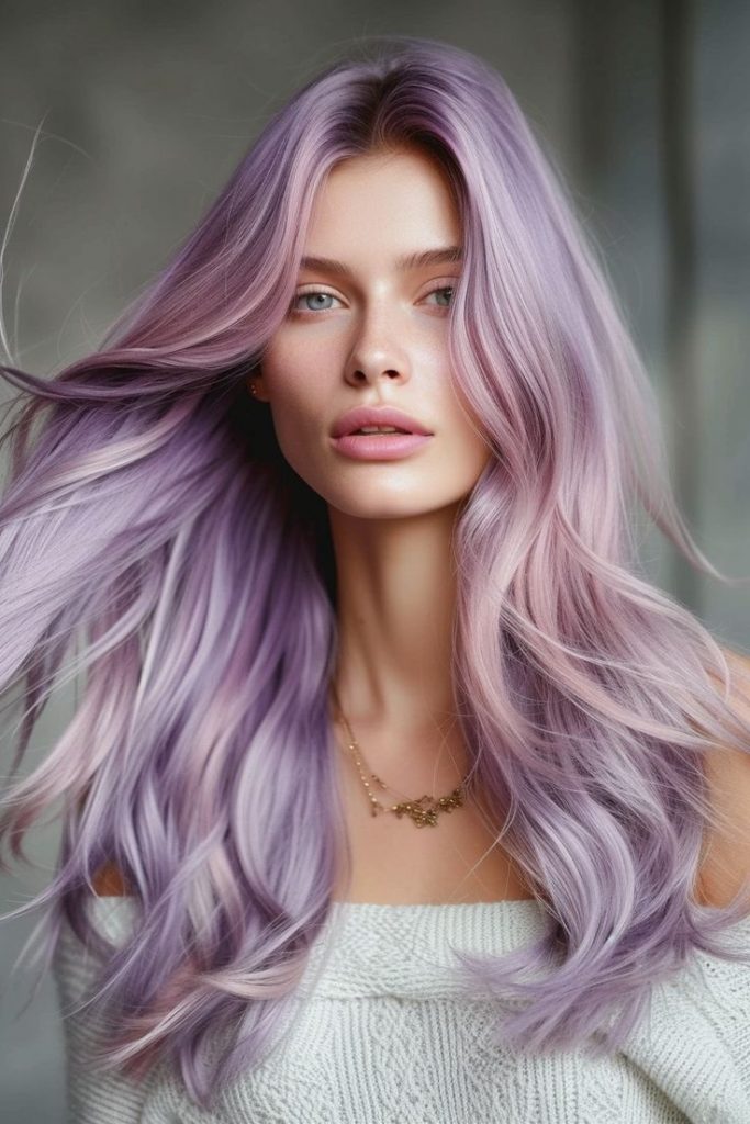 This lavender-blush blend is a dreamy, pastel-inspired look perfect for winter 2024. The soft lavender hues combined with light pink undertones create a whimsical yet elegant appearance. It’s an excellent option for women with blue eyes, as the pastel shades complement cool undertones in the skin and eyes. If you’re looking for something ethereal and delicate, this is a perfect choice for those chilly winter months. Consider adding low lights for a bit more depth and texture.