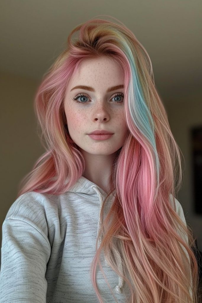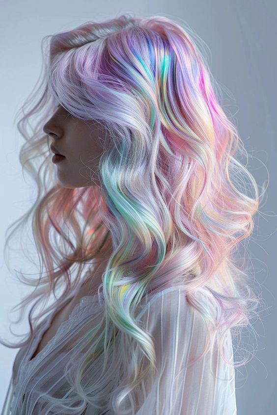 This rainbow pastel blonde look is playful and magical, incorporating soft pinks, blues, and yellows to create a stunning, ethereal effect. The highlights blend perfectly, giving the hair a soft glow that reflects light beautifully. It’s the perfect hairstyle for those wanting to embrace fun, bold colors in 2024-2025. This style is especially suited for women with blue eyes, as the pastel hues create a lovely contrast with light features.