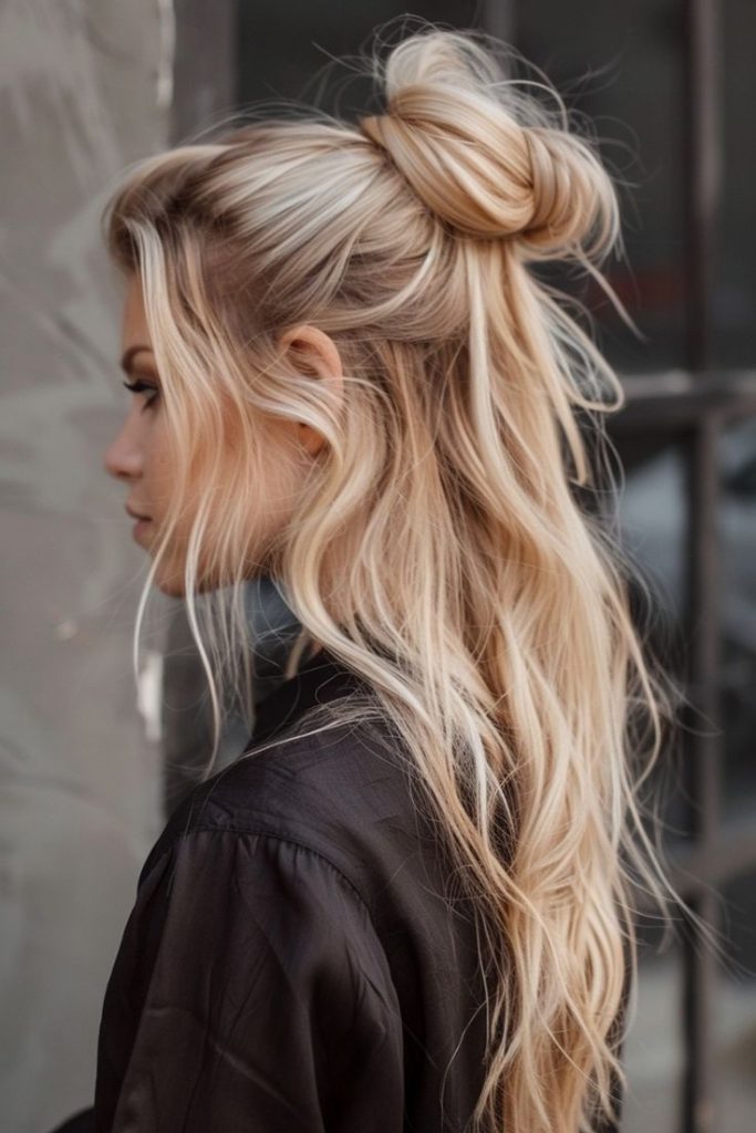 This blonde half-up bun combines effortless style with a laid-back vibe. The voluminous waves cascade down while the top is pulled into a loose bun, creating a casual yet chic look. This hairstyle is ideal for green eyes, as the soft blonde tones emphasize their natural color. The dark roots add dimension, making this look both low-maintenance and stylish, perfect for the colder months. It’s a practical yet beautiful choice for winter 2024.