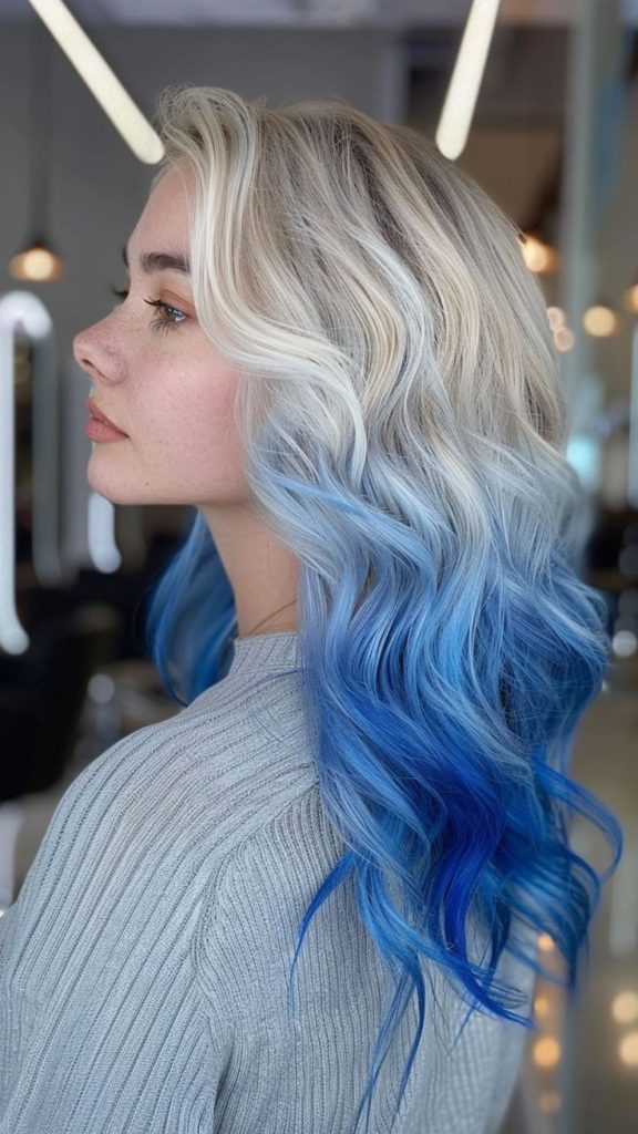 For a bold, standout look, this platinum blonde with blue ombre is perfect. The icy blonde transitions smoothly into deep, vibrant blue, making it a showstopper for those who love edgy styles. The blue eyes here are accentuated by the cool tones of the hair, creating a mesmerizing color combination. This style works well for those who want a fun and adventurous look while still maintaining a level of elegance. Ombre coloring adds a creative twist for winter 2024-2025.