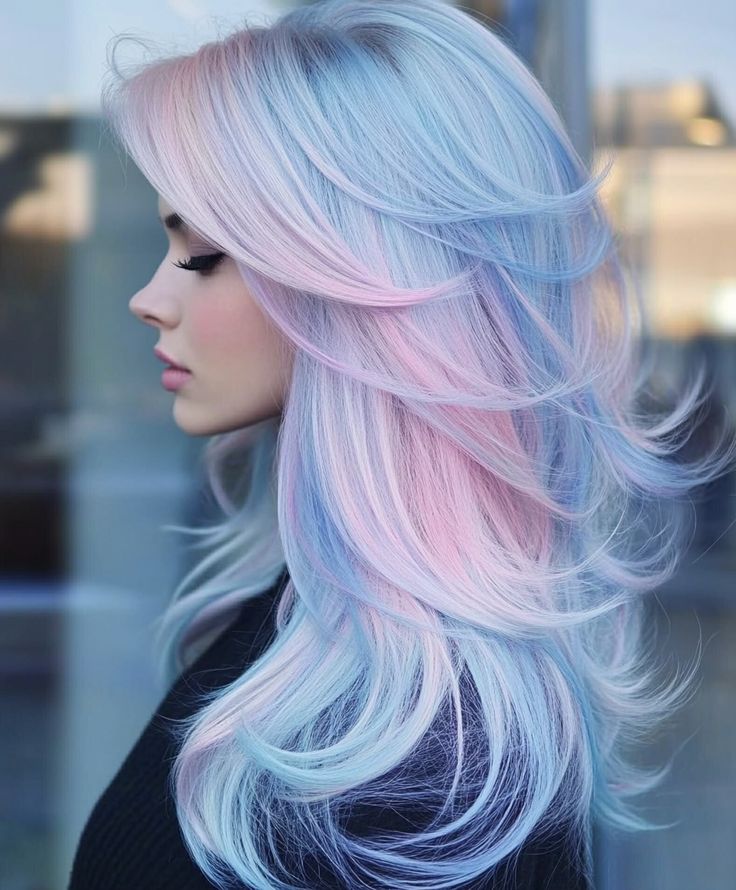 For a more adventurous approach, this pastel pink and blue hairstyle is a dream come true for those who enjoy standing out. The combination of these soft hues in ombre style gives off a whimsical, wintery vibe. Perfect for anyone looking to have fun with their hair this season, the color pattern will definitely turn heads. It’s best suited for women with blue eyes, as the soft pastels beautifully complement lighter eye colors, creating a striking appearance that’s both bold and playful in 2025.