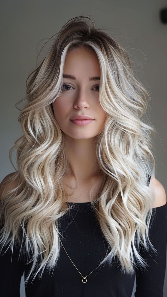 These platinum blonde waves with subtle lowlights offer a striking winter look. The dark roots create depth, making the platinum sections pop even more. This hairstyle works best for those who want to keep their blonde but add a wintery twist with lowlights that enhance the color’s depth. It’s a look that fits perfectly with brown eyes, as the contrast between light and dark creates a stunning visual.