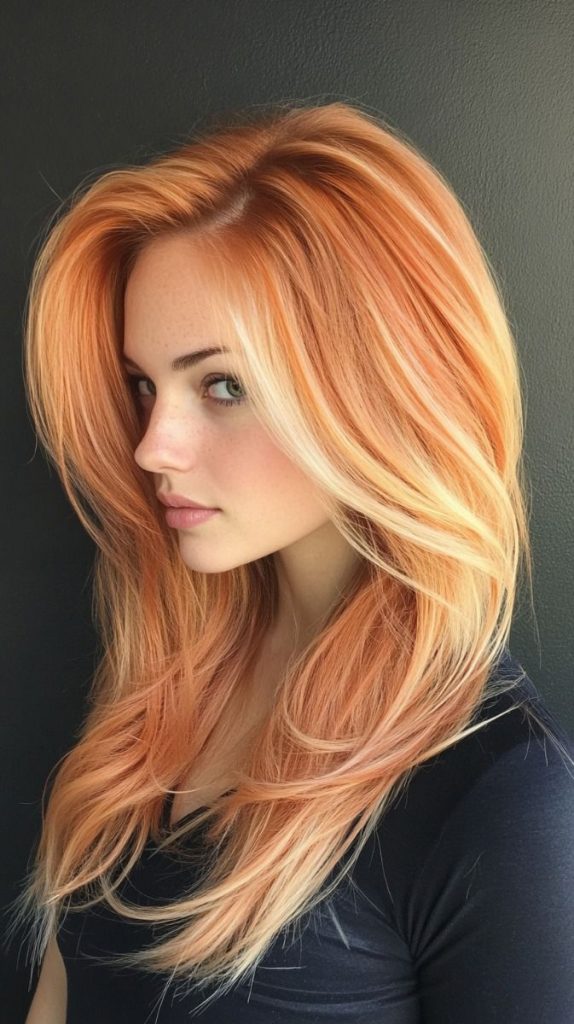 For those who prefer warmer tones during the winter season, this warm peach blonde offers a soft, sun-kissed glow. The peachy hues, blended with subtle blonde highlights, create an effortlessly romantic look. This color works wonderfully with green eyes, enhancing their vibrancy and adding a fun twist to the typical winter blonde. For those with lighter skin tones, this hue can provide a warm contrast to the cool, frosty environment. Balayage caramel highlights could be incorporated for additional dimension.