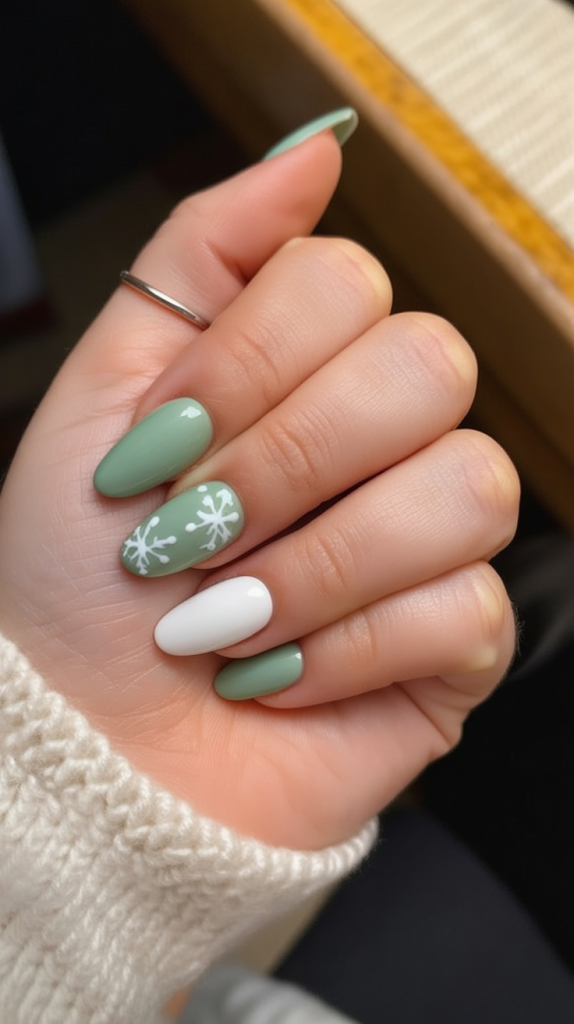 This shape compliments almond nails in particular because the protruded ends counterbalance the snowflake decorations. It is an elegant nail design that will not be out-of-date even when the trends change in 2026, as it can be put on gel or dip nails.