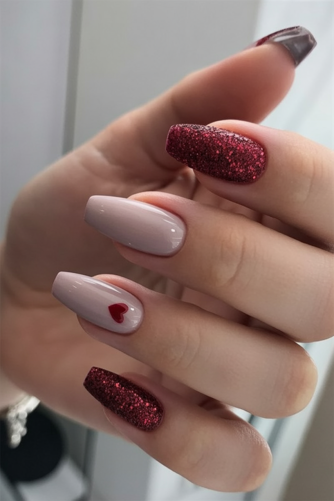 These acrylic square nails with deep red glitter and an accent of one little heart will find their match in winter romance. The difference between glittering storyline and nakedness is warm and heart-rending, ideal in intimate dates or for partying.
