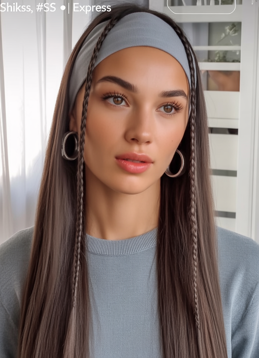 Back in 2000s, that style with a headband; except this time, the finish is smoother and grown-up. The thin braids that droop on each side act like built-in accessories by framing the face while the rest of the hair stays loose and glossy. It feels relaxed and chic, the kind of thing you’d throw on for errands and brunch or a chic winter getaway.