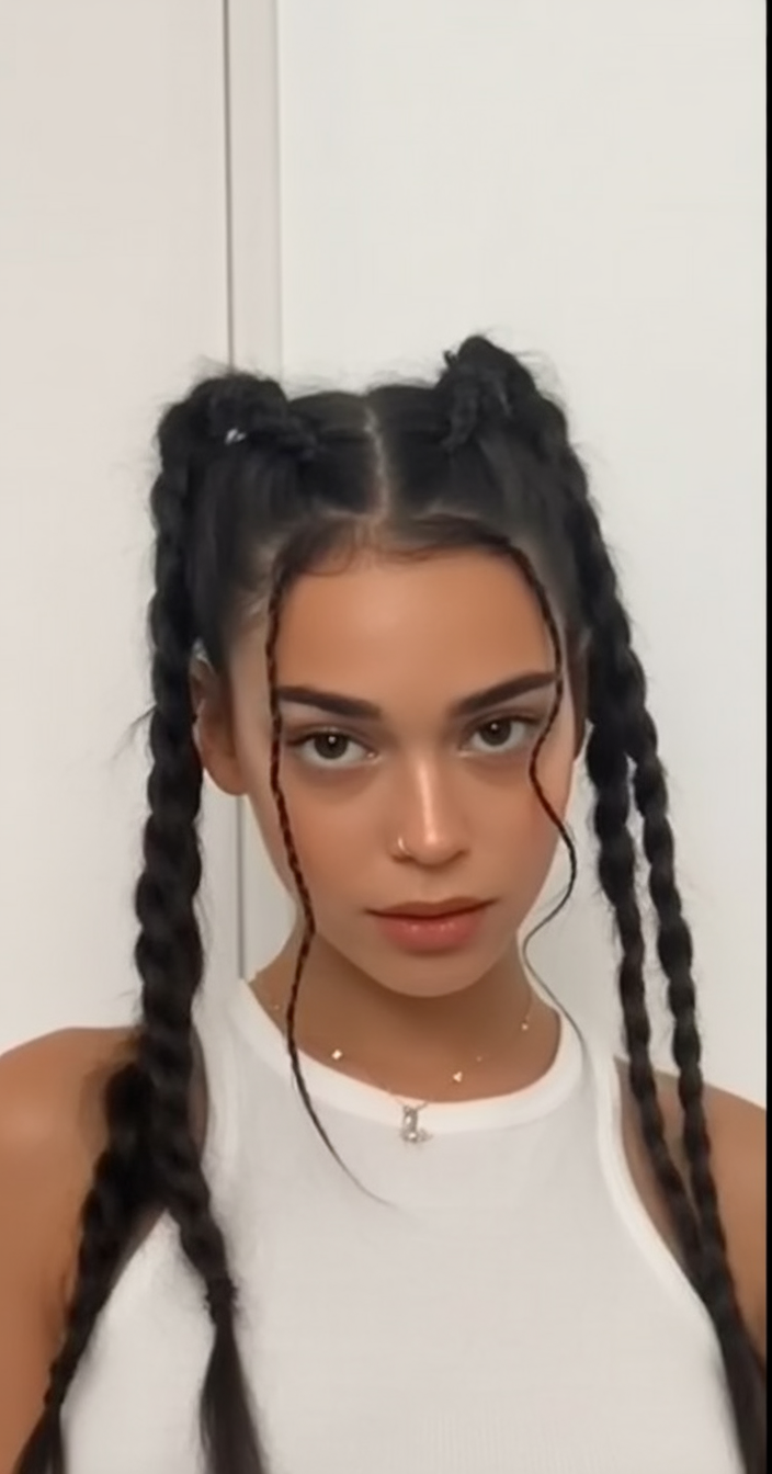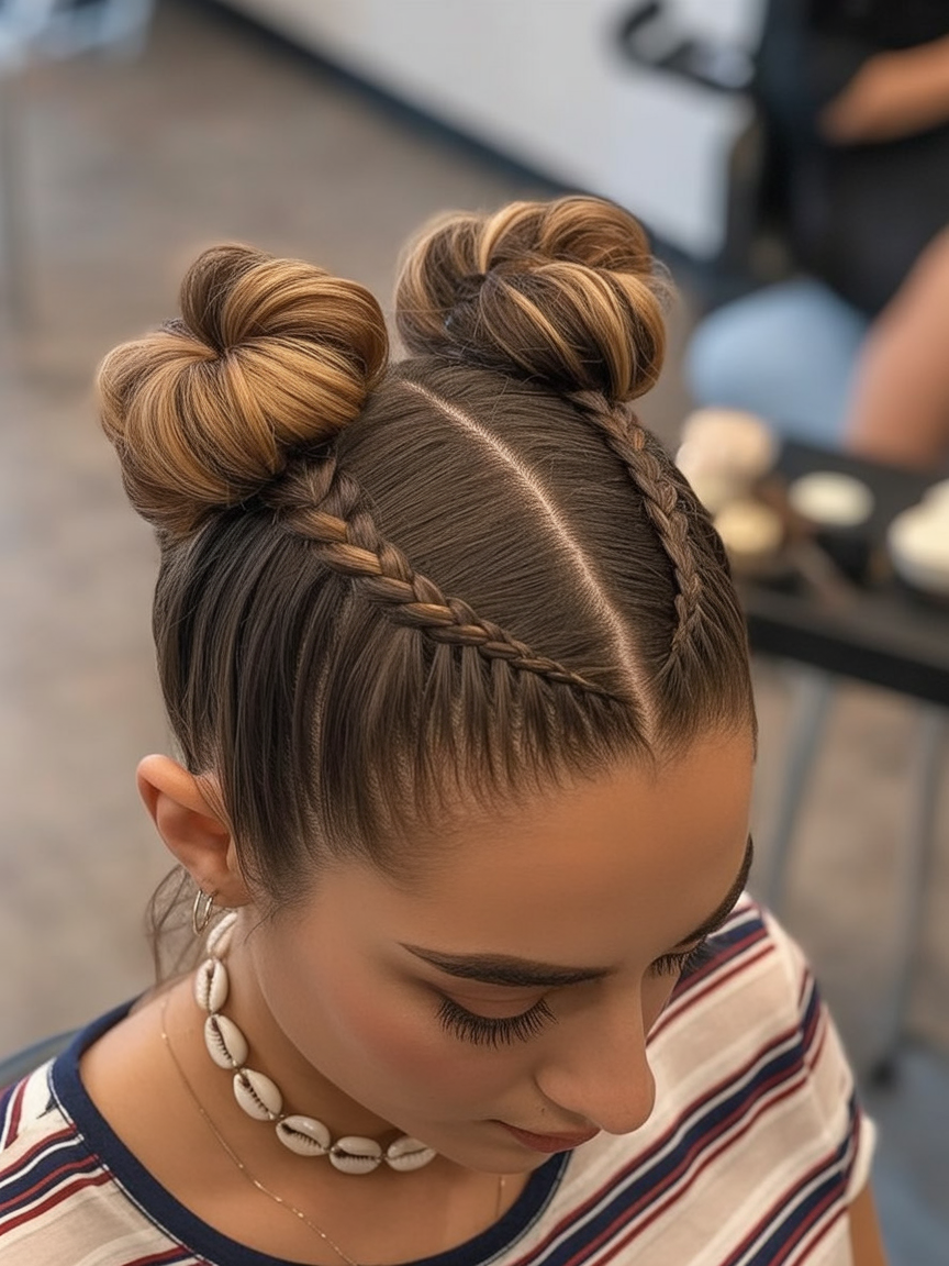 These twisted space buns with feed-in braids feel like a polished take on nostalgic style. The bump of lighter highlights wrapped into each bun adds dimension and really makes the look pop. This blends a little of the early-2000s sporty and stylish culture with a dash of beachy vibe—especially when worn with a shell necklace or striped top.