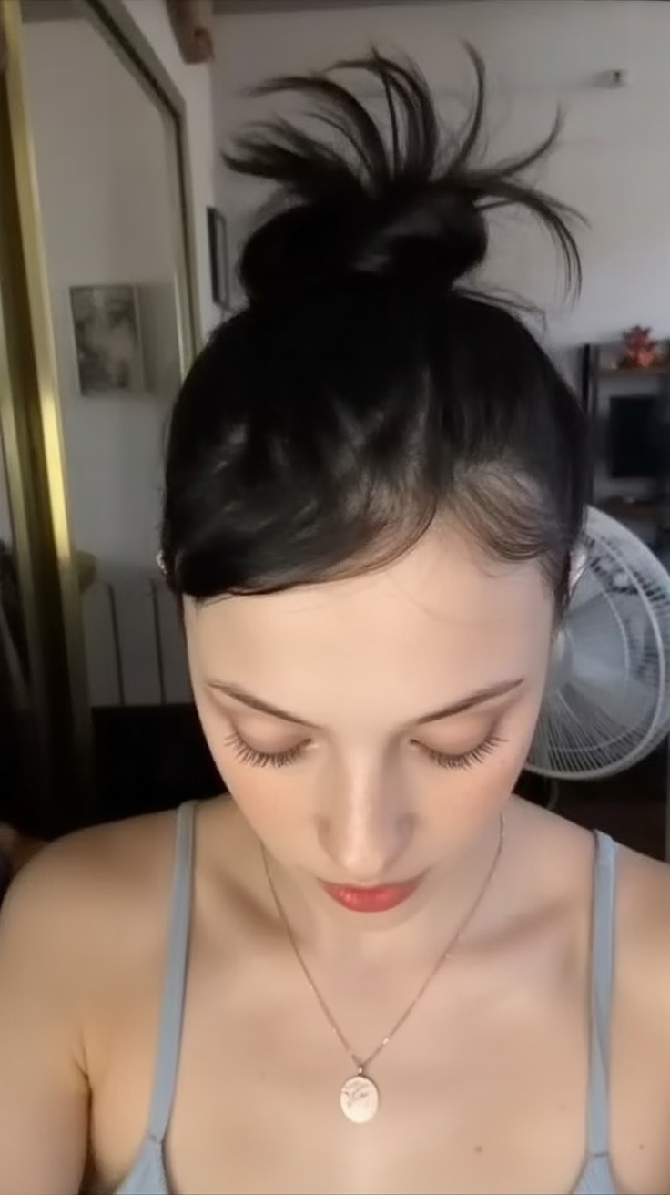 What makes it special is its shape and texture: the very tight bun at the base with ends purposefully fanned out to create volume, and the long front pieces that lengthen the facial outline wonderfully. A hairstyle perfect for straight to wavy hair and easy to secure with bobby pins or a claw clip. You can finish with a shine serum, and that is it—no complicated how-to.