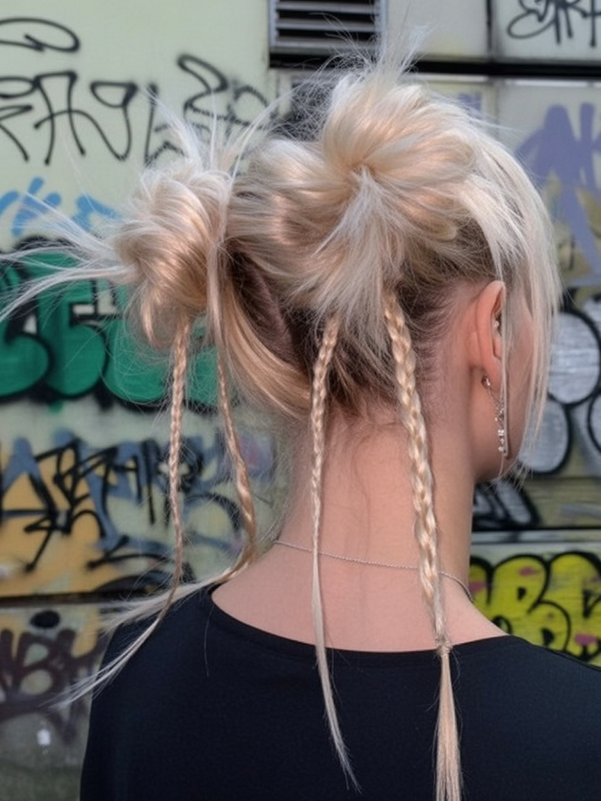 Backward, it reads like street art-two undone buns with delicate braids traipsing through the lengths. Essentially grunge: airy, textured, and slightly rebellious. The overall shape feels quite young and fresh, while the softness around the nape of the neck makes it wearably feminine. Great throw-on style for running errands, competing with outdoor dinners where the most important thing is movement and personality.