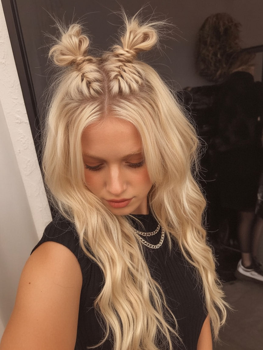 1. Dutch Braided Mini Buns on Long Blonde Waves