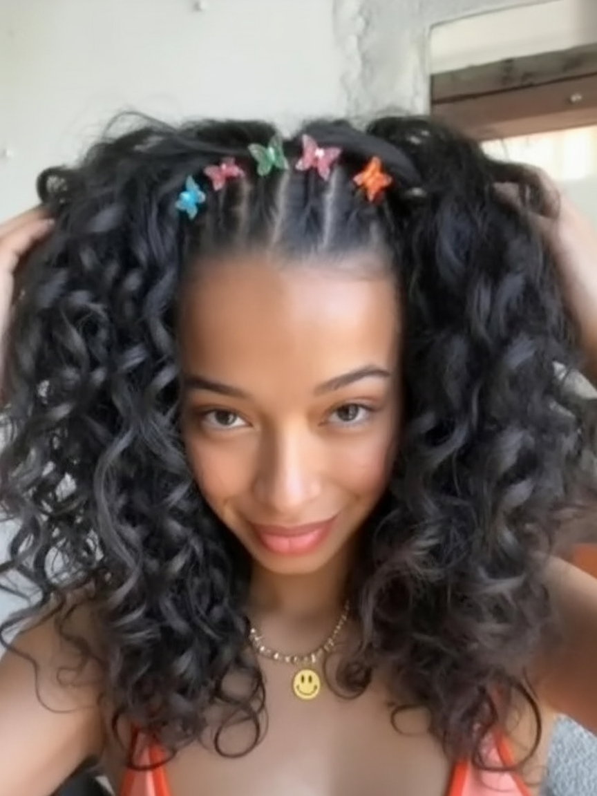 A happy hairstyle-tiny front cornrows peppered with Butterfly clips, opening into a halo of lively curls. It is playful and sun-kissed, the kind of texture one feels like smiling back at. The colors of the clips pay homage to the 2000s without feeling like a costume, while the curly hair remains a star: full, buoyant, and gorgeously free.