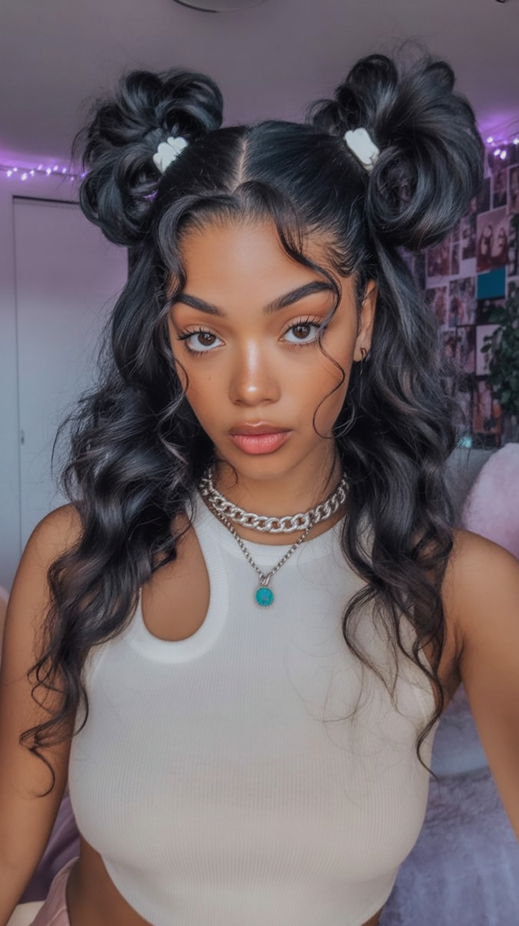 Ideal for curly hair, wavy hair, or heat-styled texture. Part down the middle and twist two buns near the crown, letting the rest cascade freely. Light mousse or curl cream keeps definition without crunch. Add hoops or layered necklaces to lean fully into the aesthetic.