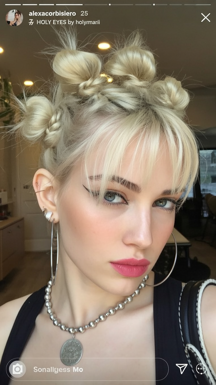 Four singular little buns scattered across the crown under playful wispy bangs translate all the 2000s attitude to the max. The style feels bold but not overdone-think-would wear it to a concert, a costume party, or even just to make a regular day feel fun. The soft fringe balances out the sculptural buns and whimsy into sweetness.