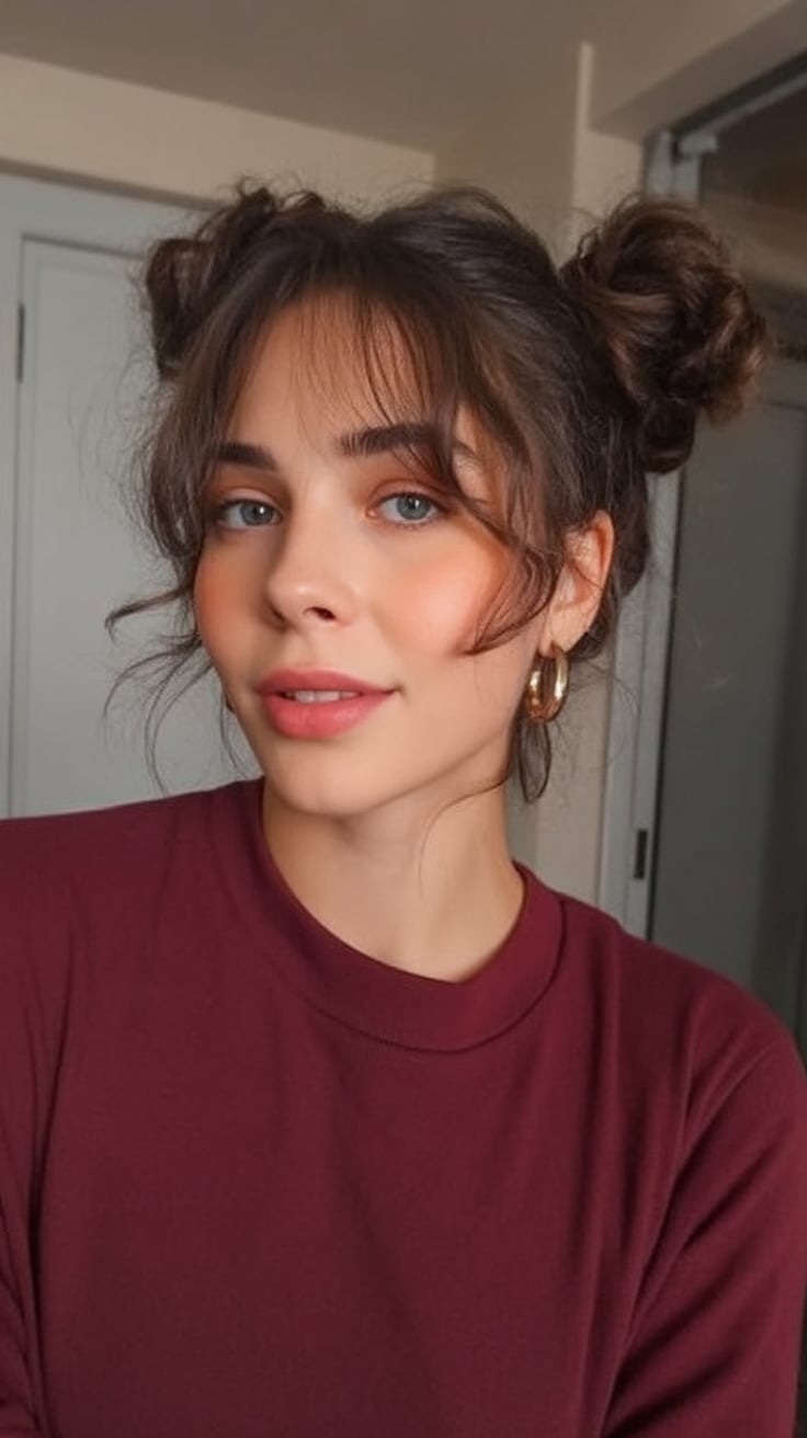 Trend note for 2026: space buns are back as an easy updo that plays nicely with bangs. Curl two small face pieces with a wand, keep the rest in high buns, and let a few sections fall naturally. Works on straight, wavy, and curly hair; on black women, it highlights texture brilliantly. Finish with light shine spray so the curls catch the light without stiffness.