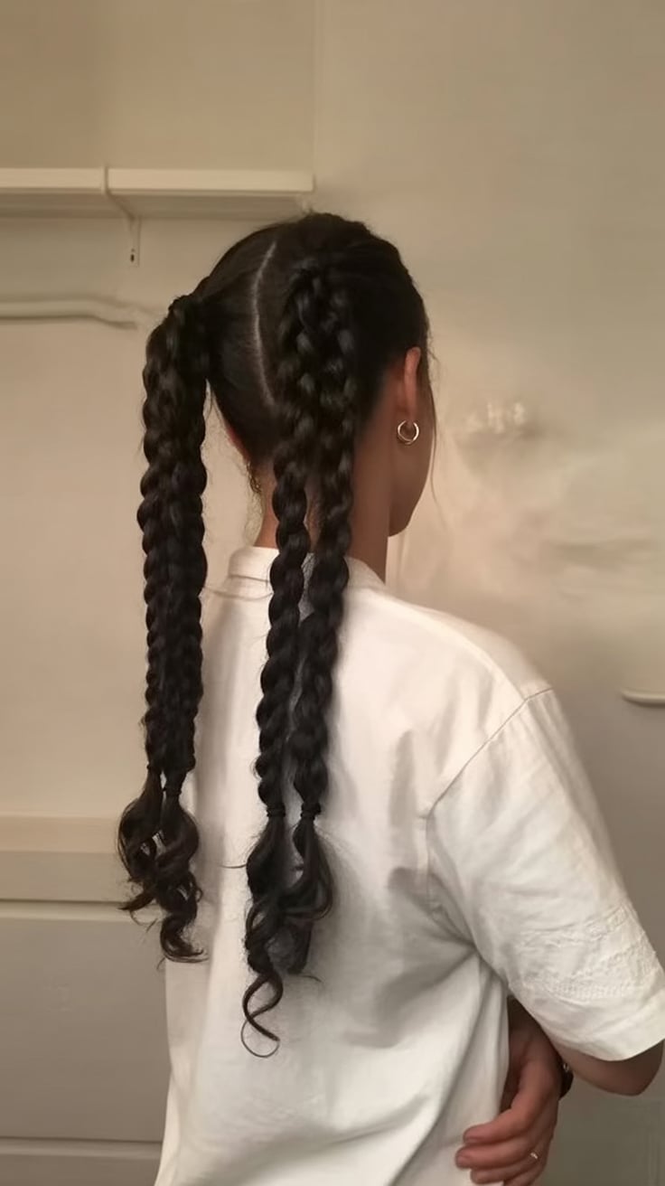This version of boxer braids secretively retains a lot of hair at the ends, hence adding to its bounciness while being gentler to the scalp. Works into straight, curled, wavy, and stretched-out curly hair. If you are interested in, this is one to easily learn: braid to mid-head, secure with elastics, curl the tails, done.