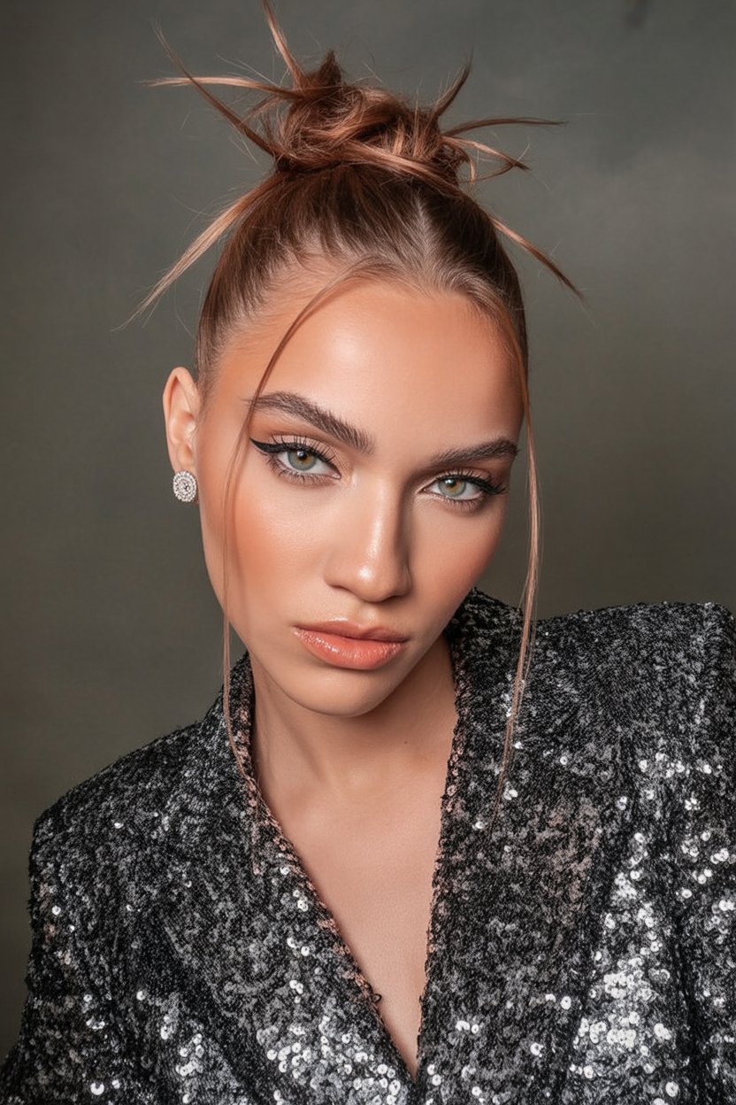 Styling: mist the roots with a volumizing spray for lift, gather hair into a high ponytail, loop, and pin—do not hide the ends, as they should be spiky. Smooth flyaways around the hairline with some light pomade. It works on straight hair, wavy hair, or even curly hair if you let some texture show. A bit of gloss on the lips, and you’re done for a quick-and-easy look.