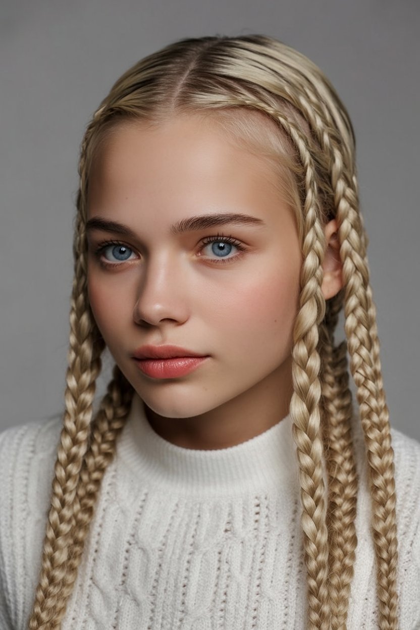 There is something quietly striking about perfectly parted hair with long, even braids draped over the shoulders. The look will channel the minimalist side of the 2000s- clean, smooth, and symmetrical. It almost Editorial calm, drawing out the eyes and cheekbones without any additional accessories.