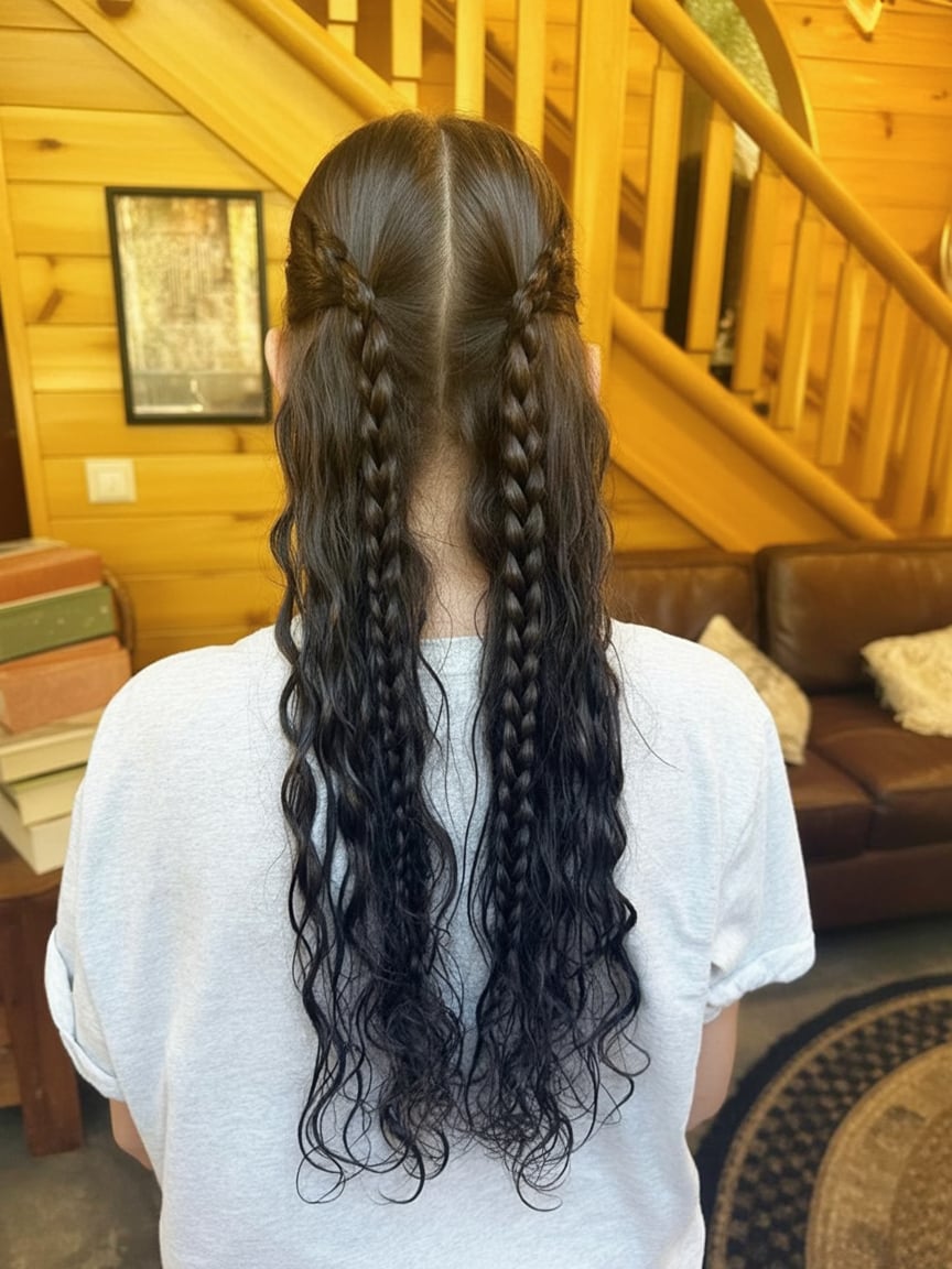 Here is the more effortless version of the Y2K style: four thin braids floated onto loose waves. The style is understated, romantic, and perfect for when you want subtle detail rather than drama. The straight center part elongates the face, with that braid acting like jewelry, invisibly adding texture as you move. Think weekend cabins, gallery cruising, and dinners on the deck.