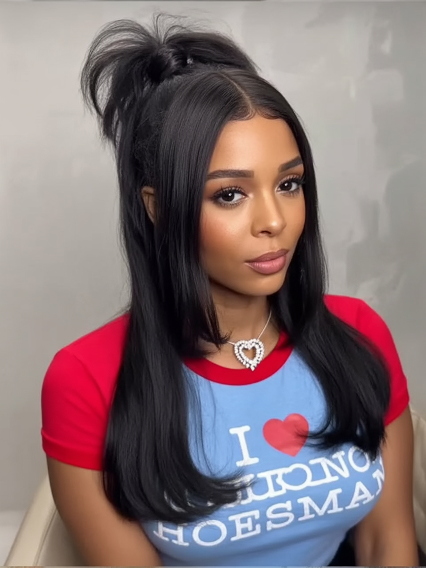 The half-up spiky ponytail is pure millennium energy—lift at the crown, sleek lengths below, and just enough movement to feel flirty. It frames the face with clean layers and draws eyes upward, making it flattering for almost every face shape. The center part keeps it modern and polished.
