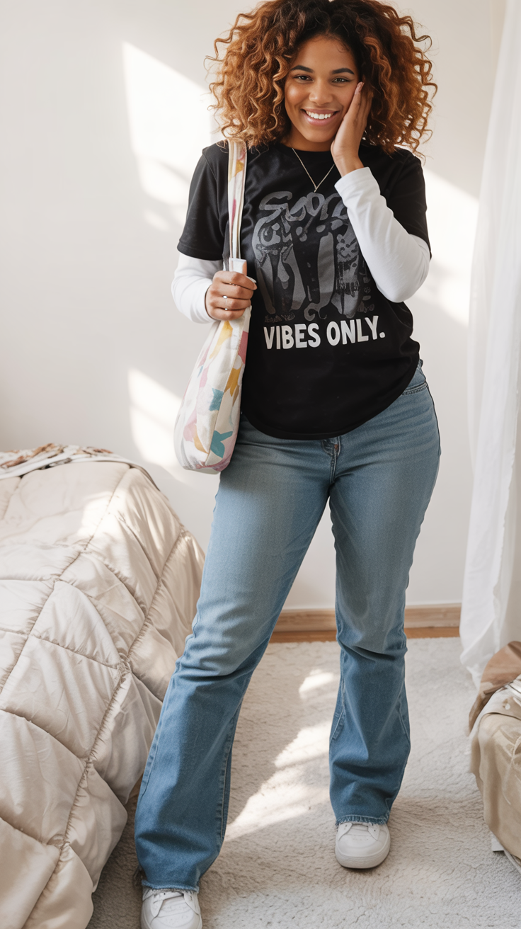 This look is the friendly side of Y2K outfits in 2026: a graphic tee layered over a white long-sleeve, soft bootcut jeans, and sneakers that were clearly made for walking. Her curls and relaxed smile make the whole outfit feel like a hug, perfect for those busy days when you still want to look pulled together. It’s simple, real, and full of inspiration for everyday street styles without any drama.