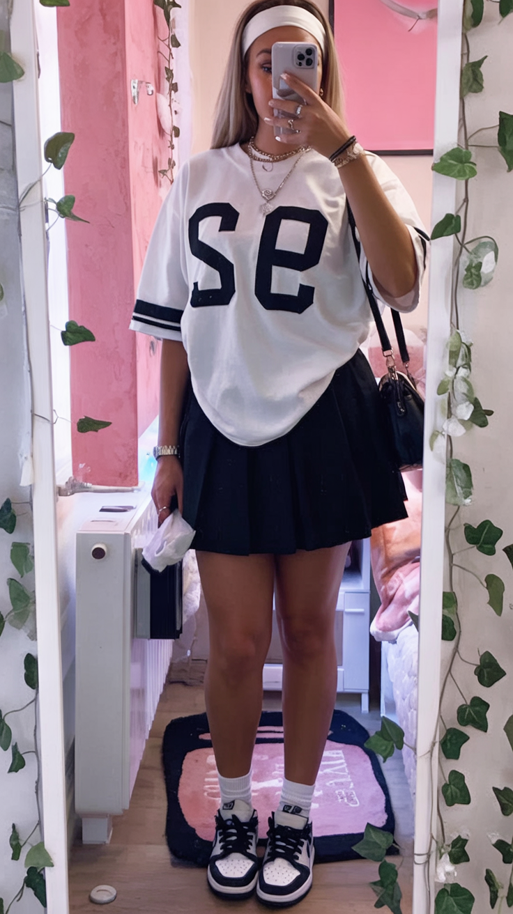 This look taps into the cutest side of 2000s culture: an oversized varsity tee, a pleated mini skirt, a sporty headband, and sneakers ready for a long day on your feet. It feels like a mix of tennis club and high school hallway, but styled through the lens of a grown woman who knows exactly what suits her. It’s sporty, cute, and just the right amount of flirty, with big potential for street-style aesthetic photos.