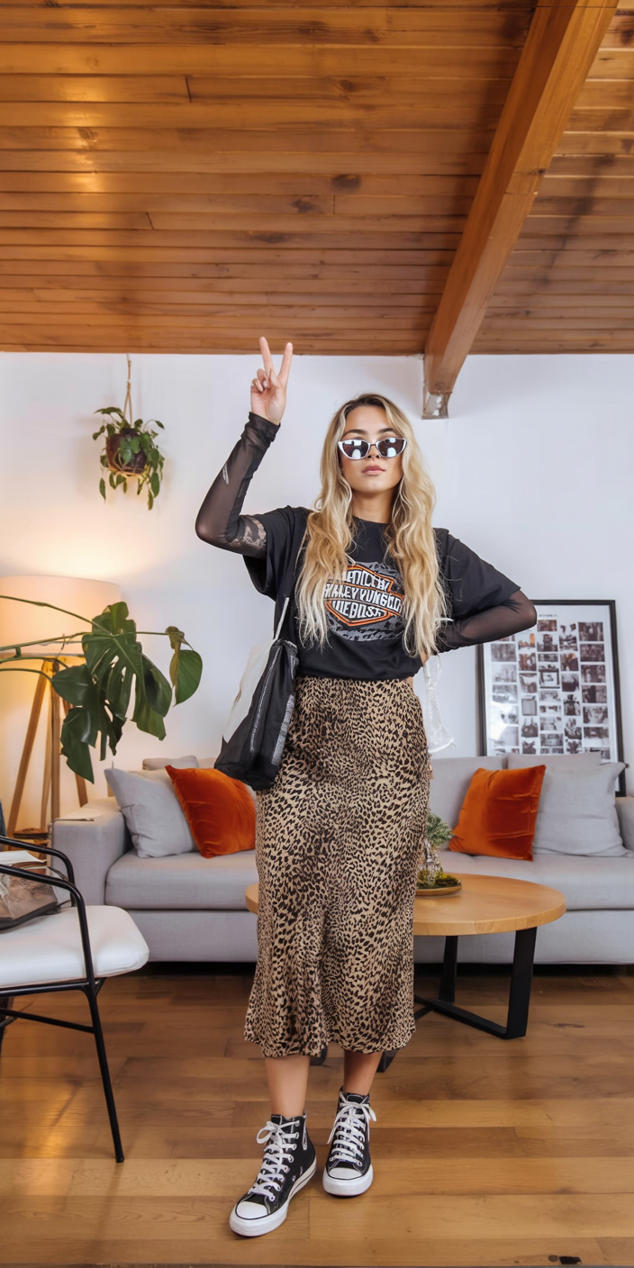 This outfit is what happens when a party girl’s energy grows up but never loses her spark. A slinky leopard midi skirt, sheer mesh sleeves, and a bold logo tee come together with high-top sneakers for that perfect mix of grunge and glam. The peace-sign pose says it all—she’s relaxed, fun, and fully herself, whether she’s heading to a house gathering or a late-night concert.