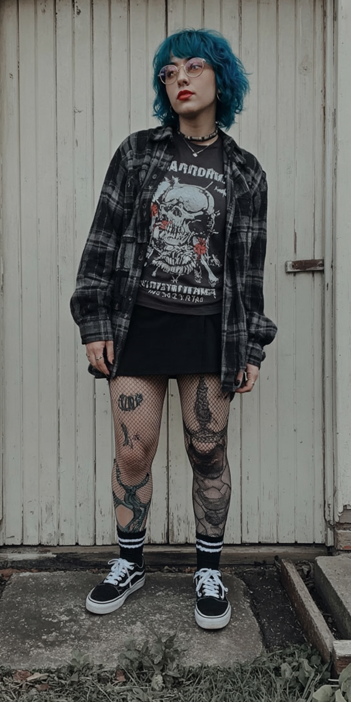 This outfit is for the days you wake up feeling a little rebellious. The oversized plaid shirt thrown over a graphic tee, tiny skirt, fishnets, and sneakers channels pure grunge attitude with a wink. The blue hair and round glasses give it that quirky aesthetic you’d expect from a street-style photo set, but the bones of the look are classic: layers, textures, and a strong personality. It’s the kind of ensemble that makes you feel like the cool art teacher everyone secretly wants to be.