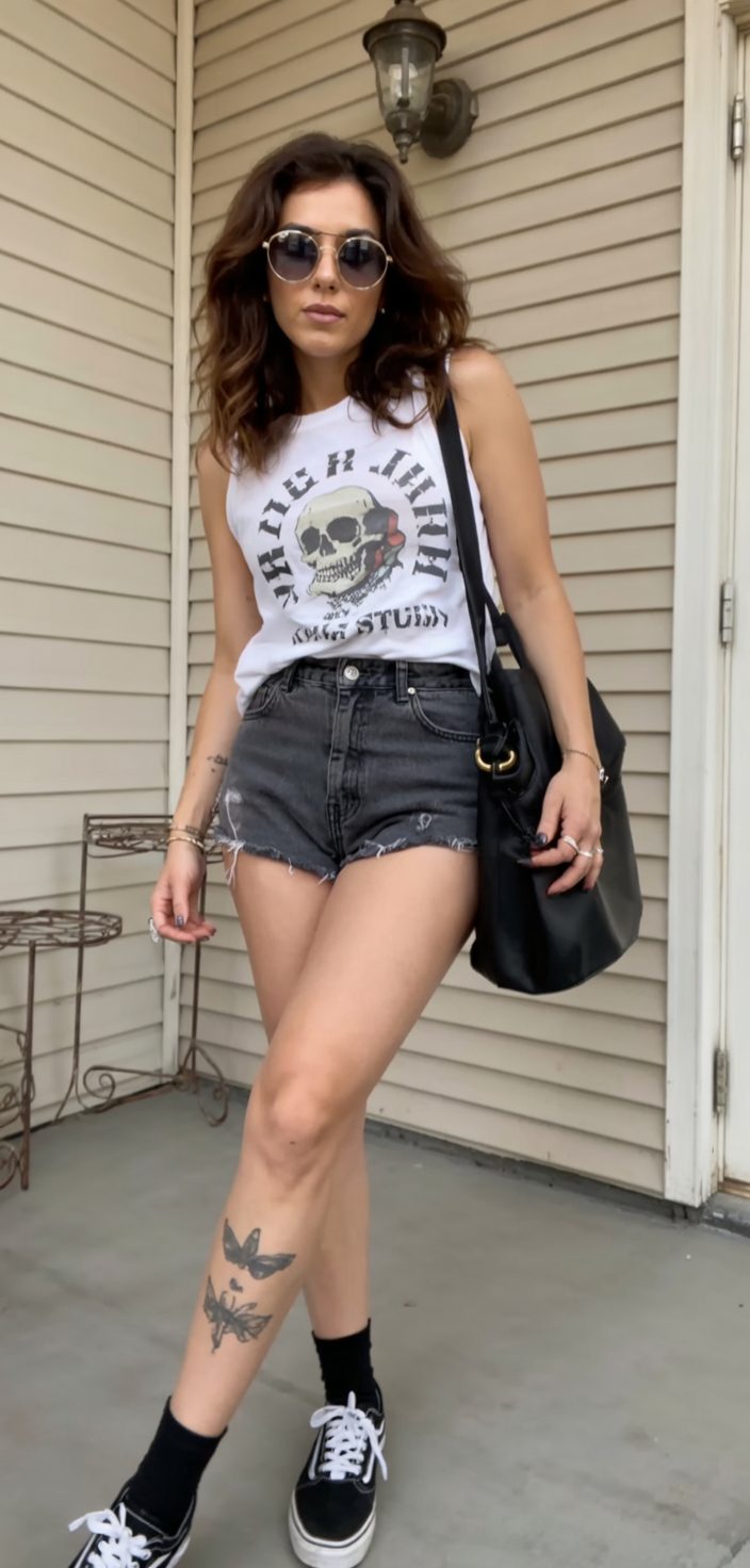This look is pure summer rebel energy: a skull-print muscle tee, frayed black shorts, and classic sneakers that have clearly seen a few late nights. It feels like the grown-up version of your favorite 2000s concert outfit, just a little more polished and a lot more confident. The sunglasses and big slouchy bag make it real street style rather than festival cosplay, and the tattoos peeking out add that edgy twist y2k outfits 2026 are all about.