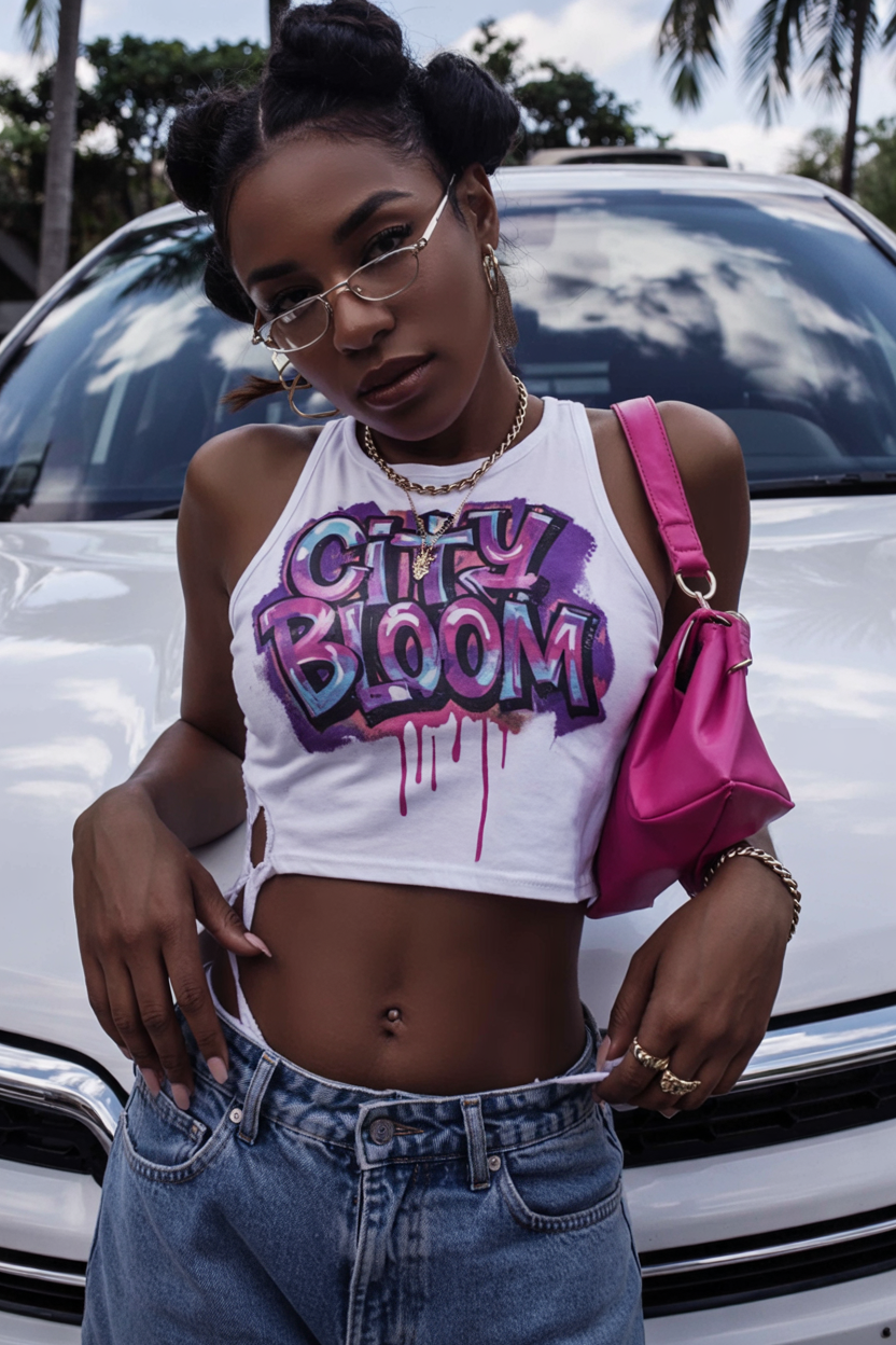 This outfit is basically a love letter to street styles in the sun. A graffiti-style crop top, low-slung jeans, and slick gold jewelry create that perfect blend of cute and edgy, while the pink bag and space buns keep it playful. It’s giving Roblox-meets-real-life in the best way—animated, fun, and totally unapologetic. This is the kind of Y2K 2026 inspo that makes you want to book a summer trip immediately.