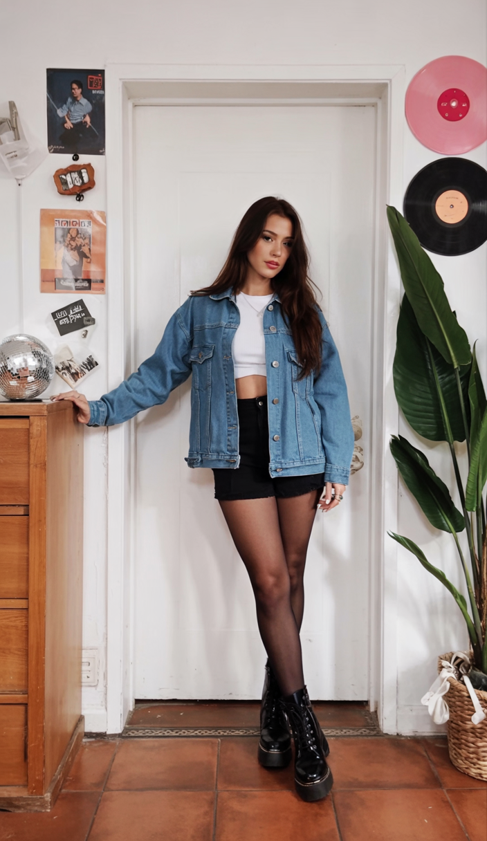 This outfit feels like a love letter to teenage bedrooms, complete with vinyl on the wall and a disco ball in the corner. A classic denim jacket, cropped white tank, black shorts, and sheer tights give strong 2000s street styles while still feeling very now. Chunky platform sandals or boots anchor the look in that edgy, almost Gothic territory, but the clean white top keeps it fresh. It’s the perfect mix of nostalgic and grown-up, like slipping back into your favorite playlist—but with better tailoring.