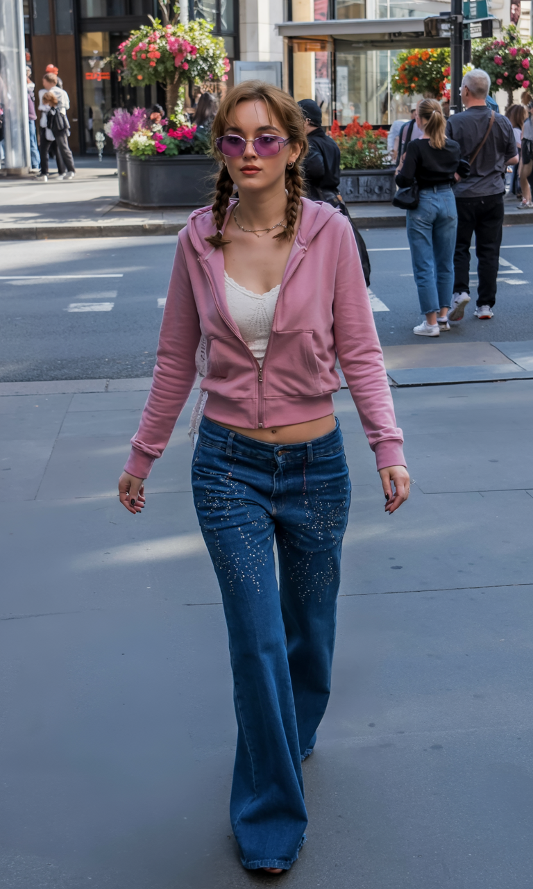 Here’s the Y2K 2026 fantasy in its most wearable form: a snug pink hoodie, low-rise jeans sprinkled with tiny sparkly studs, and easy braids that feel cute rather than childish. It’s the kind of look you throw on for a city stroll and suddenly realize you’re matching the sunshine and shop windows. The combination of exposed waistline and relaxed denim gives that unmistakable 2000s silhouette, but the overall vibe is softer and more grown—like the main character of your own streaming drama.