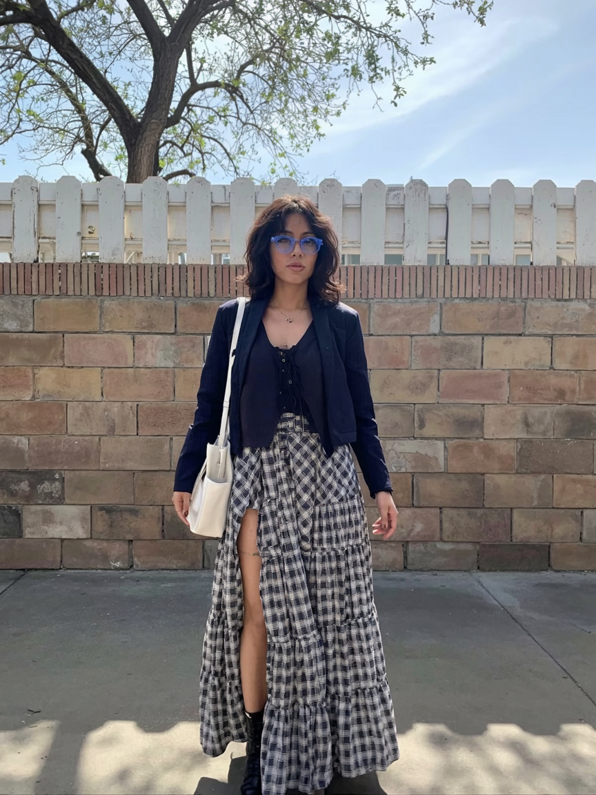 This look takes the romantic maxi skirt and toughens it up just enough for modern street styles. A checked tiered skirt with a high slit, lace-up top, and fitted jacket creates a sweeping silhouette that still feels grounded thanks to sturdy boots and a structured bag. It’s part cottagecore, part 2000s city girl, and the combination makes you feel like you’re starring in your own indie film on a bright summer afternoon. Soft hair and glasses keep it approachable and real.