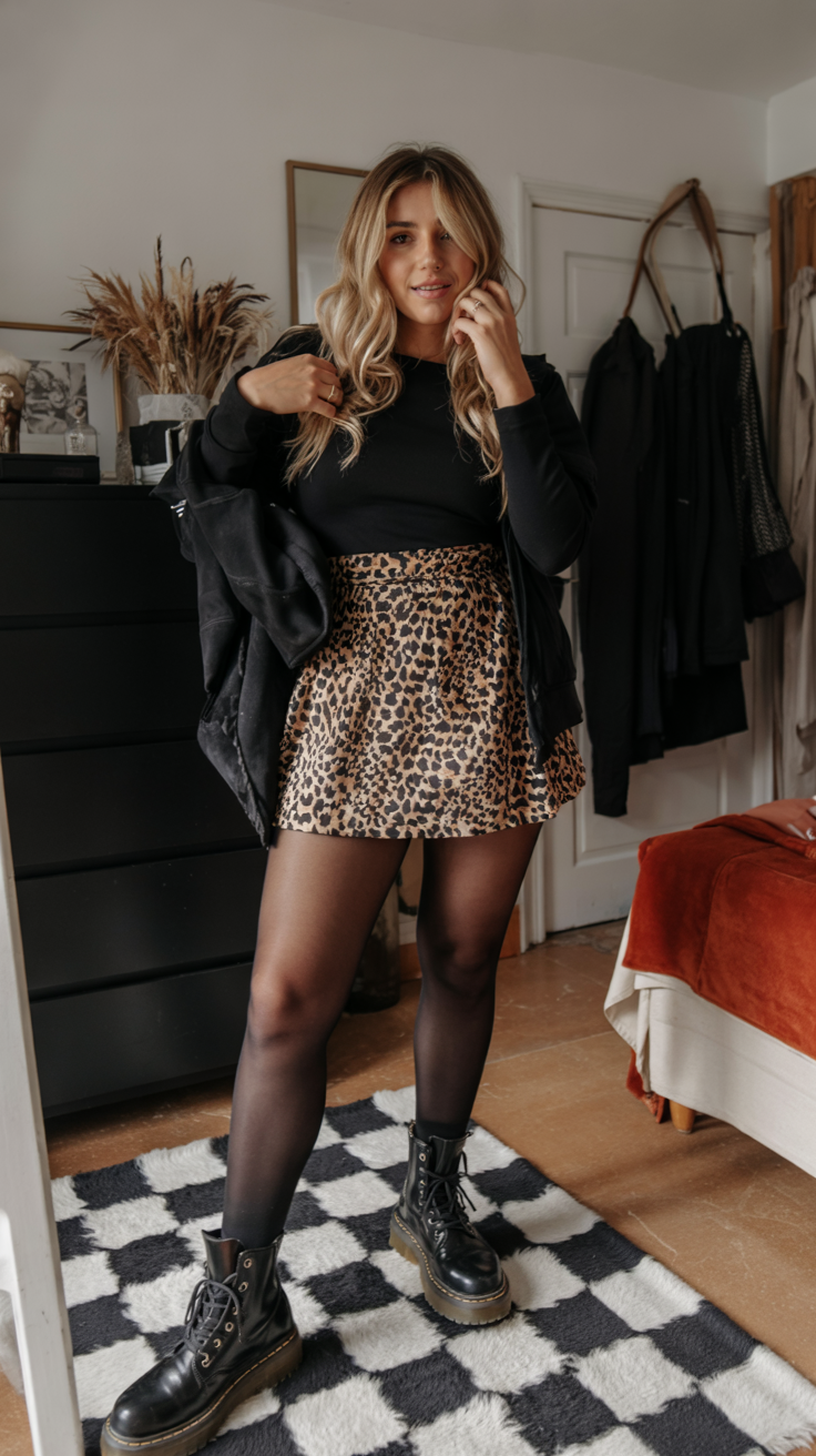 Leopard print has officially graduated from “wild choice” to modern neutral, and this mini-skirt look proves it. Paired with a fitted black top, sheer tights, and sturdy boots, it feels like the 2000s It-girl uniform all grown up. There’s a hint of party energy even if you’re just heading to a casual dinner, and the overall silhouette is flattering on so many body types. It’s cute, confident, and just a little bit dangerous—like you know your worth and your angles.