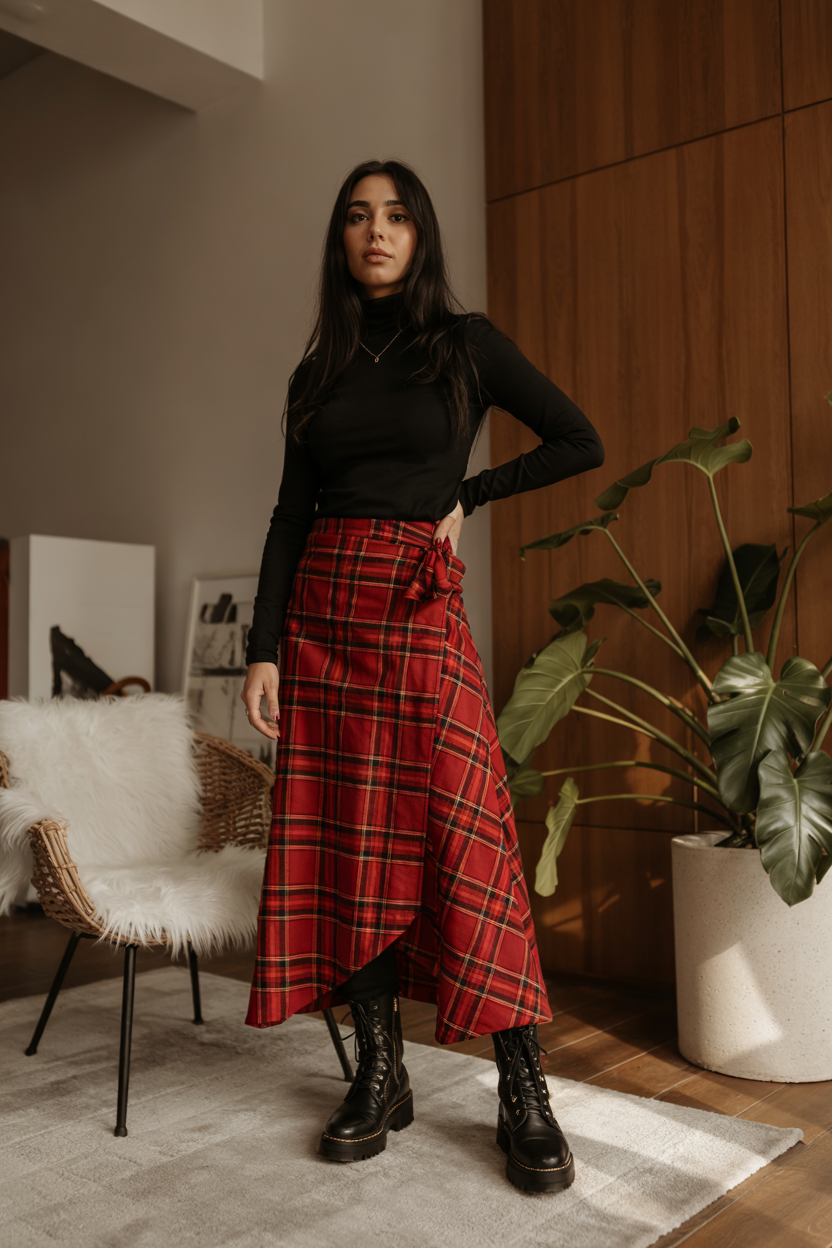 There’s something instantly iconic about a red tartan skirt, especially when it’s wrapped and tied just so over tough boots and a sleek black top. This look feels like the cool art girl from school finally grew up, got her life together, and kept her style intact. The long lines of the skirt and the fitted turtleneck skim the body in a really flattering, actually grown-woman way, while the boots bring in that subtle grunge edge.