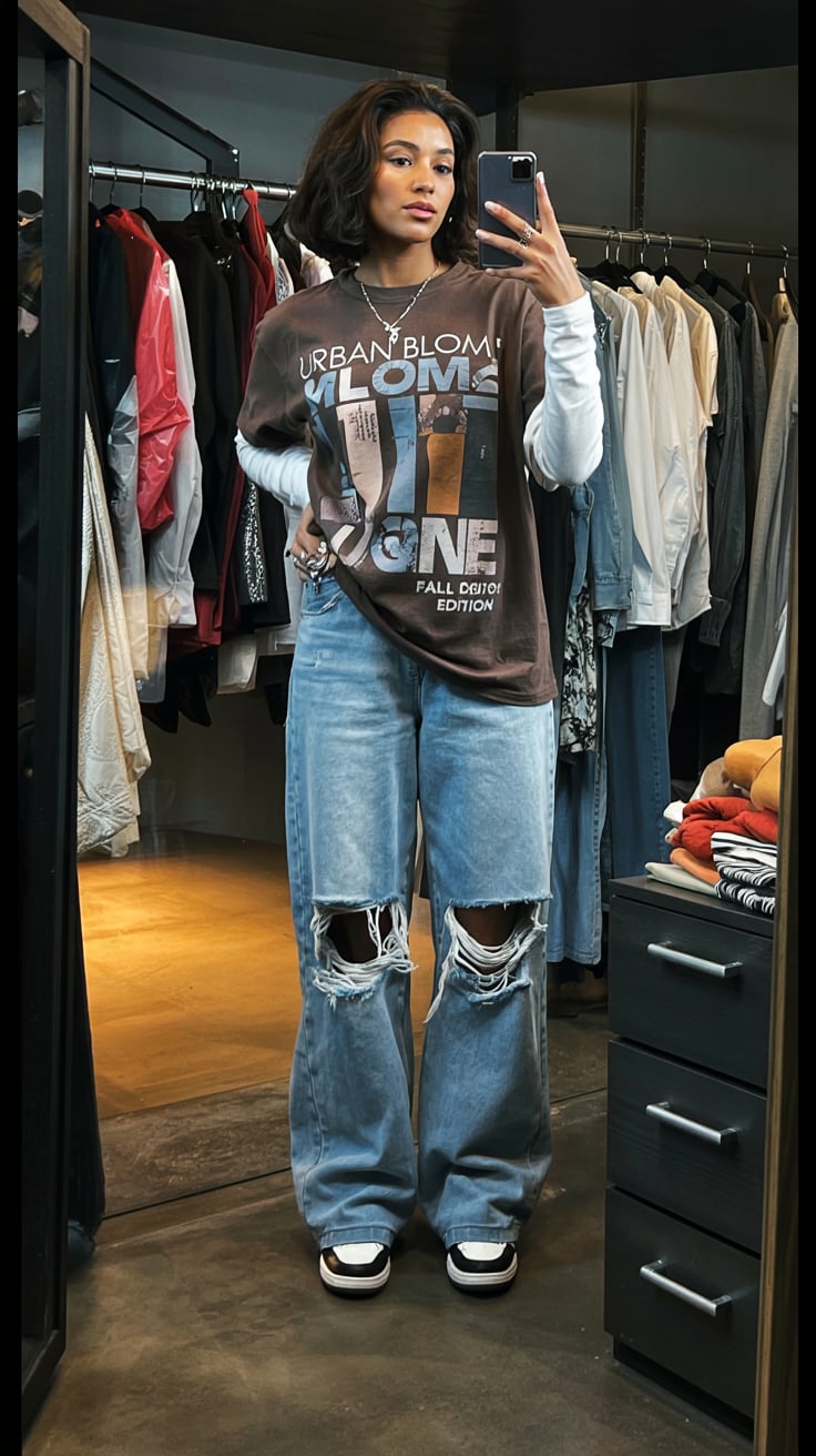 This outfit feels like autumn in your first apartment all over again: warm light, a beanie pulled down low, layered tees, and big ripped jeans you practically live in. It has that cute, slightly emo nostalgia without tipping into costume, and the mustard underlayer adds a little hint of pumpkin-spice warmth. It’s the kind of look you wear when you’re curled up with friends, trading life updates and laughing about the 2000s like they were yesterday.