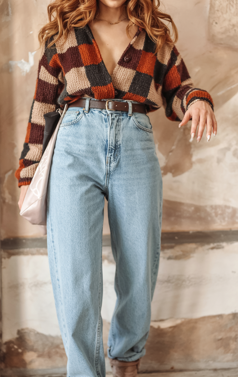This look whispers “weekend coffee date” in the best way. A deep V checkerboard cardigan in warm autumn tones, belted high at the waist, sits over relaxed light-wash jeans for a softly retro feel. It calls back to 2000s thrift finds while still feeling fresh enough for 2026, especially with loose waves and a simple necklace. It’s casual, comfortable, and quietly iconic.
