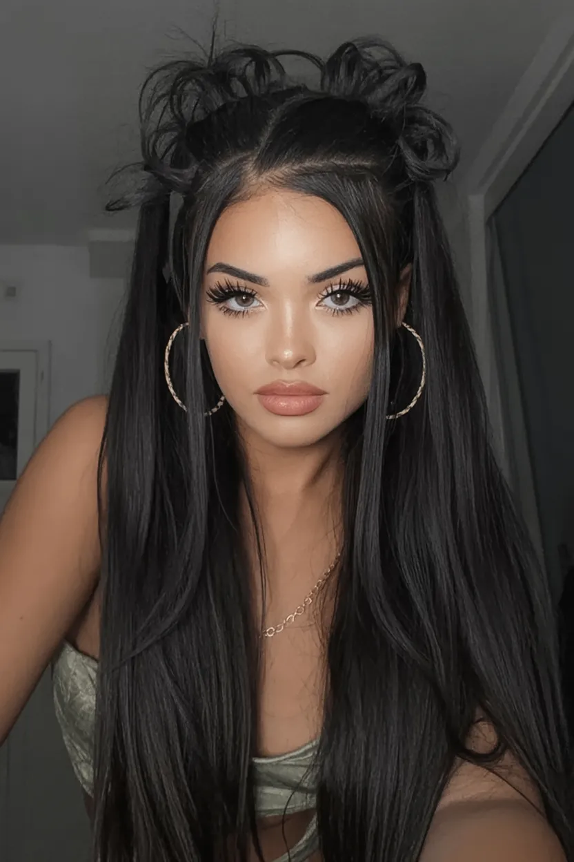 This look is pure baddie drama with a playful twist. The messy little buns on top bring in that cheeky, almost Alt energy, while the ultra-long straight hair underneath keeps the whole thing glamorous and sleek. It feels bold, feminine, and just a bit theatrical in the best possible way. You can imagine it with hoops, liner, glossy lips, and that exact expression that says she didn’t come to blend in. The contrast between the volume at the crown and the sharp straight lengths is what makes it so striking. It gives you that doll-like, Insta-ready finish without feeling overcomplicated, and that’s exactly why it works so well for a modern baddie mood.