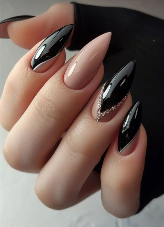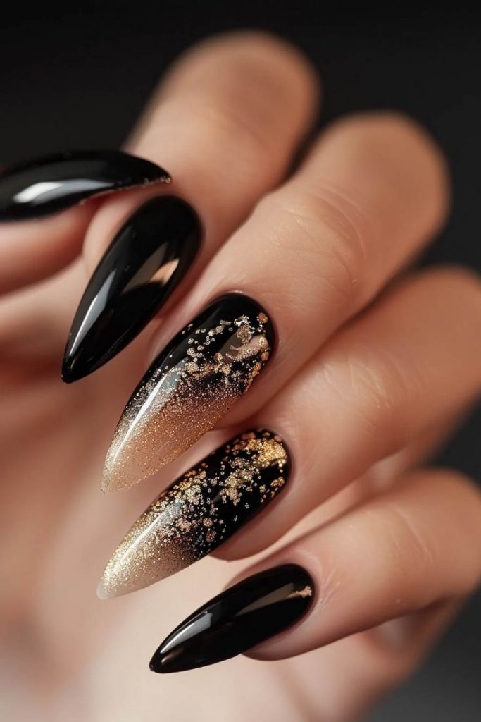 Black nails with a dazzling glitter ombre finish are a stunning choice for those who love bold yet elegant designs. This look features jet-black tips transitioning into a gradient of shimmering gold. The stiletto nail shape adds sophistication, elongating your fingers while ensuring you stand out at any event. Perfect for holiday parties or formal occasions, this style combines high gloss with sparkle for maximum impact.