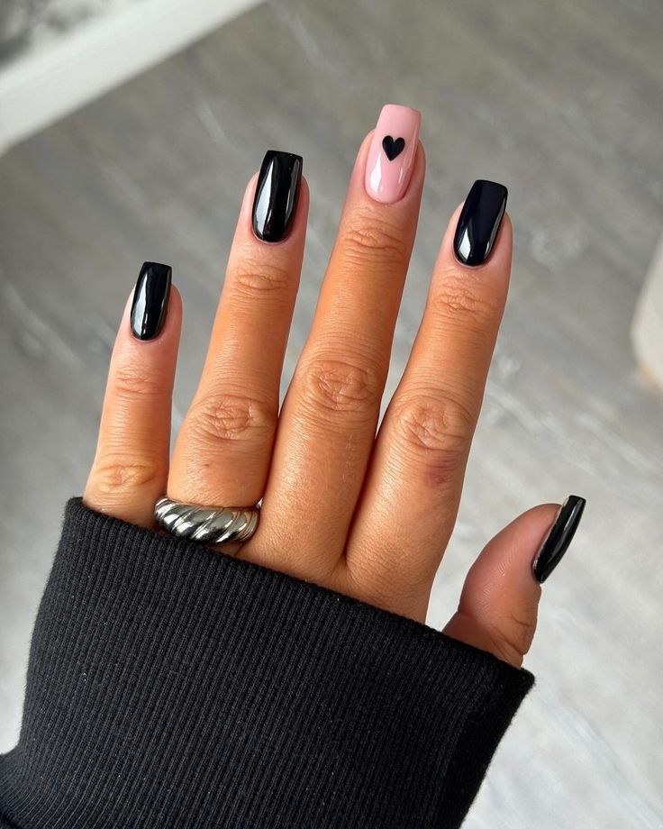 Combining black polish with soft pink nails and a dainty heart accent, this square design is perfect for casual days or fun gatherings. The acrylic coffin style is both trendy and functional, making it an excellent choice for those who want a chic yet practical look.