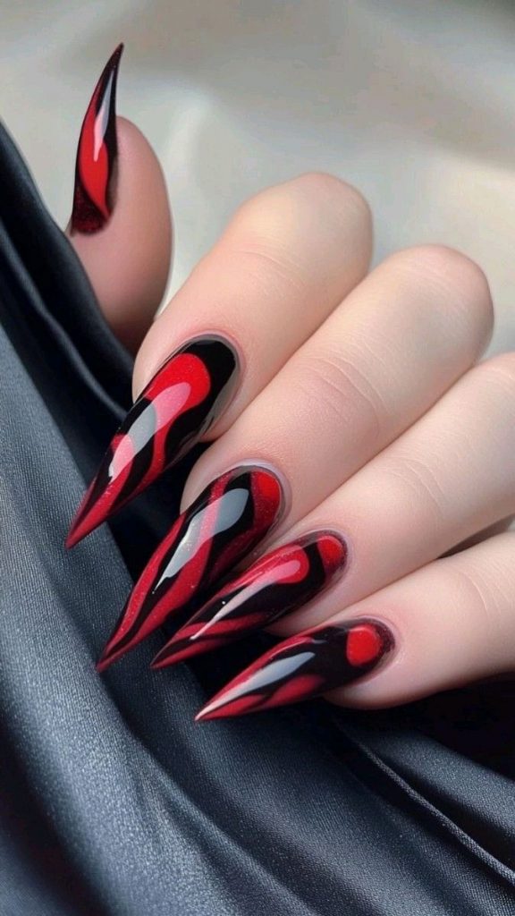 For those who love drama, black nails with vivid red and tips are the perfect statement. This stiletto shape elongates the fingers and is ideal for evening events or edgy outfits. The contrast between the black base and red accents screams high fashion.