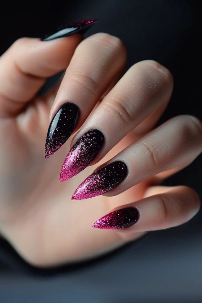 Black nails with a pink and glitter ombre are perfect for those who love sparkle. The stiletto shape adds drama, while the glittery pink transition provides a feminine twist. This look is ideal for weddings, proms, or any occasion where you want to shine.