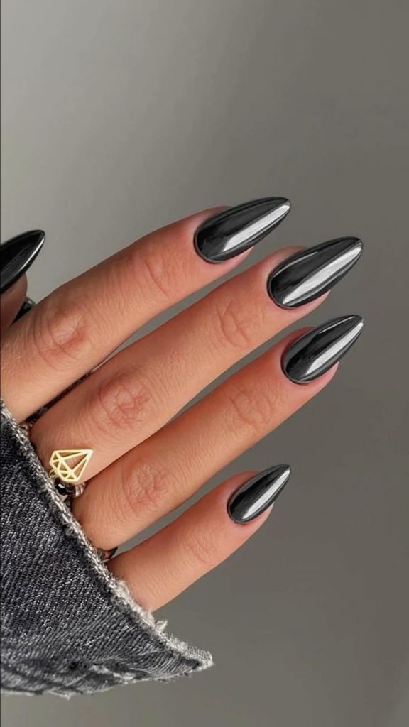 Achieve this by using a black gel nails polish for a flawless finish. Maintain with regular top coat applications to keep the shine intact. This style works well with natural nails or extensions for a polished effect.
