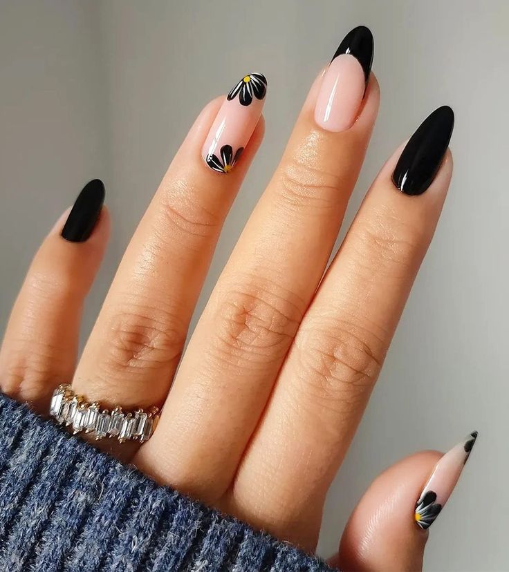 Black nails paired with delicate floral accents on a nude base bring a refreshing twist to nail art. The almond shape complements the graceful floral design, making it ideal for casual spring days or summer brunches.
