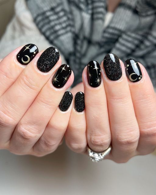 To achieve this cute look, start with black gel nails, then use nail stickers or hand-paint celestial details with a fine brush. Seal it with a high gloss top coat. Pair with gold jewelry for a coordinated effect.